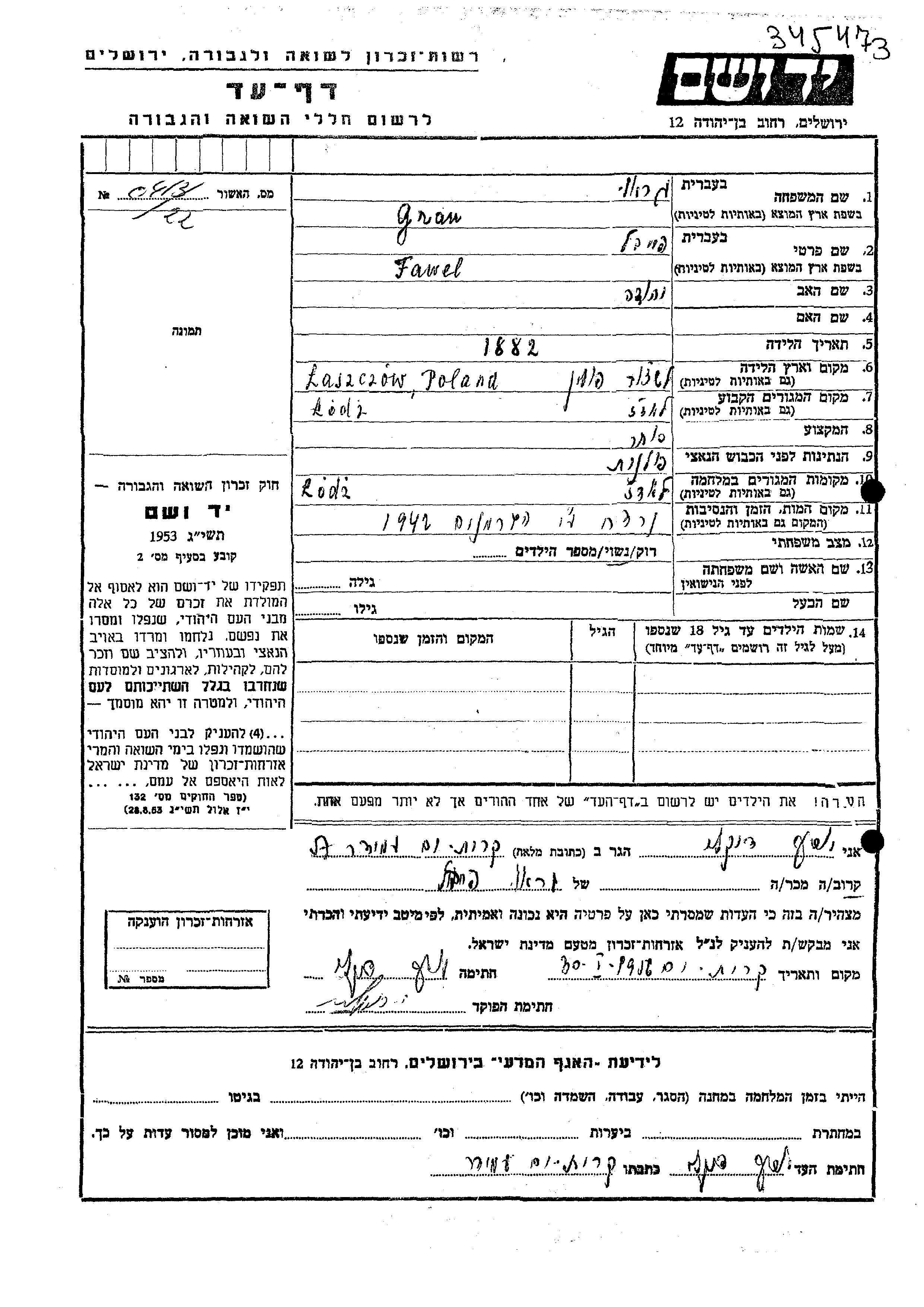 Fawel Grau wurde im Jahr 1882 in Laszczow, Polen geboren. Er war der Sohn von Yehuda. Er war Kaufmann/-frau. Vor dem Zweiten Weltkrieg lebte er in Lodz, Polen. Während des Krieges war er in Lodz, Polen.