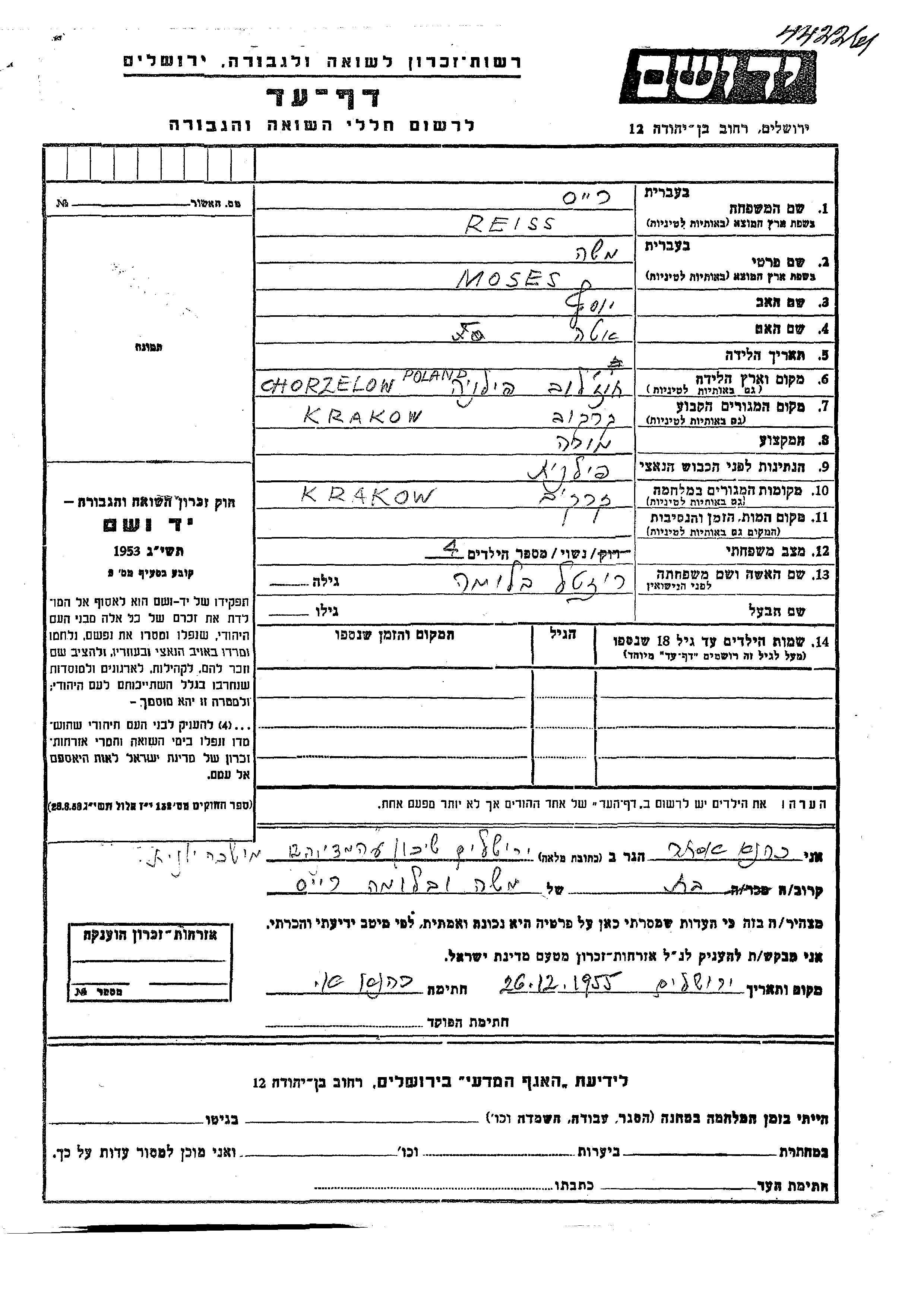 Moses Reiss wurde in Chorzelow, Polen geboren. Er war der Sohn von Yosef und Eta. Er war Lehrer/in und mit Bluma, geb. Roztal Verheiratet. Vor dem Zweiten Weltkrieg lebte er in Krakow, Polen. Während des Krieges war er in Krakow, Polen.