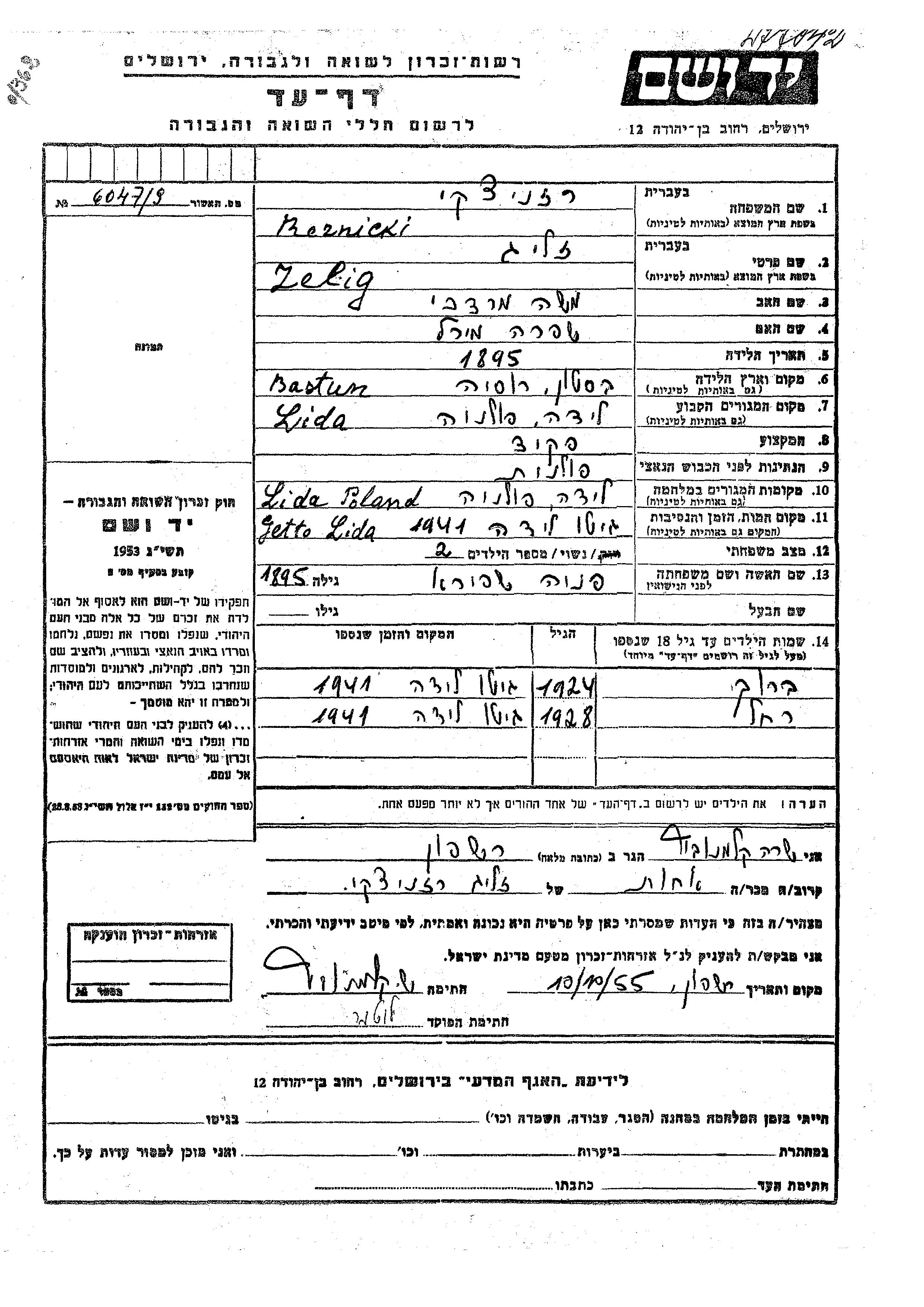 Zelig Reznicki wurde im Jahr 1895 in Bastun, Litauen geboren. Er war der Sohn von Moshe Mordekhai und Shifra Mirl. Er war Angestellte/-r und mit Fania, geb. Shapira Verheiratet. Vor dem Zweiten Weltkrieg lebte er in Lida, Polen. Während des Krieges war er in Lida, Polen.
