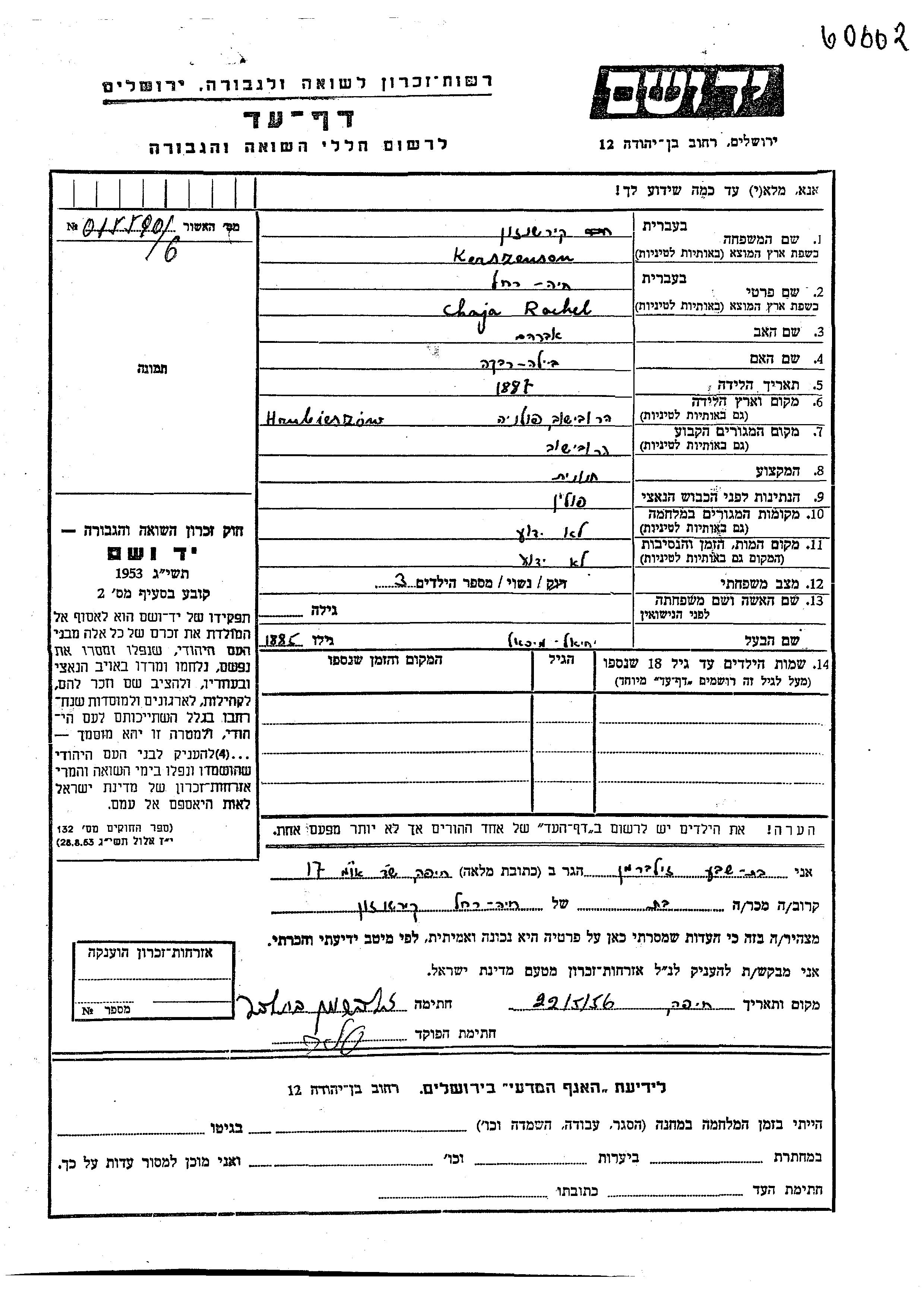 Kerszenson Chaja Rachel 1887 Hrubieszow, Polen Gedenkblatt