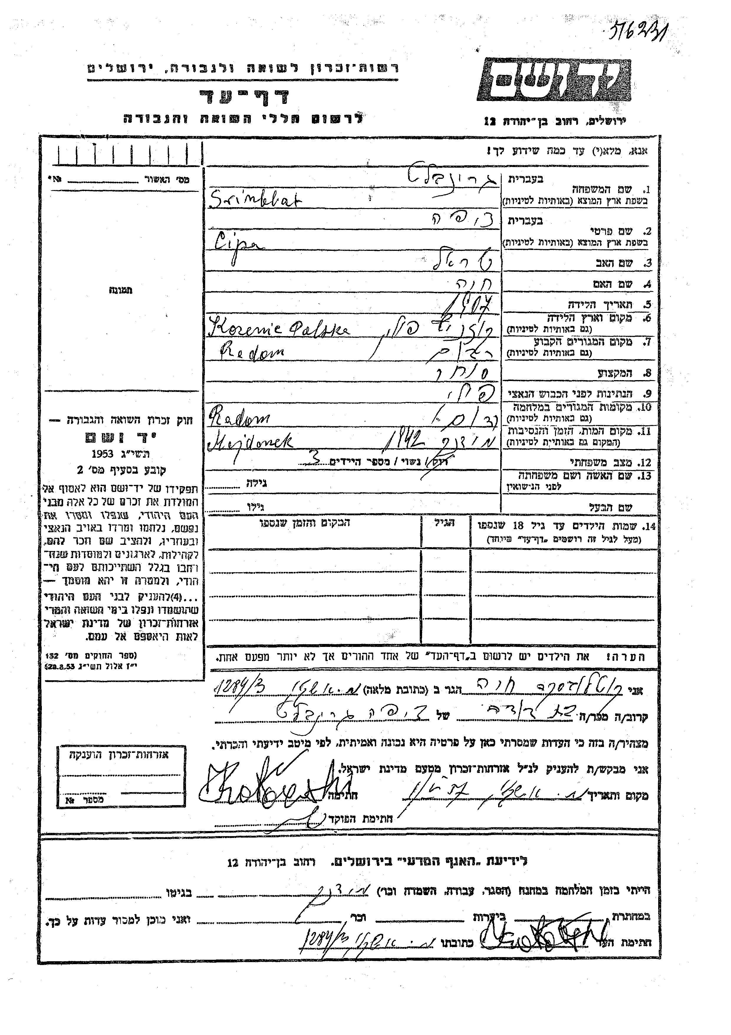Cipa Grinblat wurde im Jahr 1907 in Kozenitsy, Polen geboren. Sie war die Tochter von Yisrael und Khava. Sie war Kaufmann/-frau und Verheiratet. Vor dem Zweiten Weltkrieg lebte sie in Radom, Polen. Während des Krieges war sie in Radom, Polen.