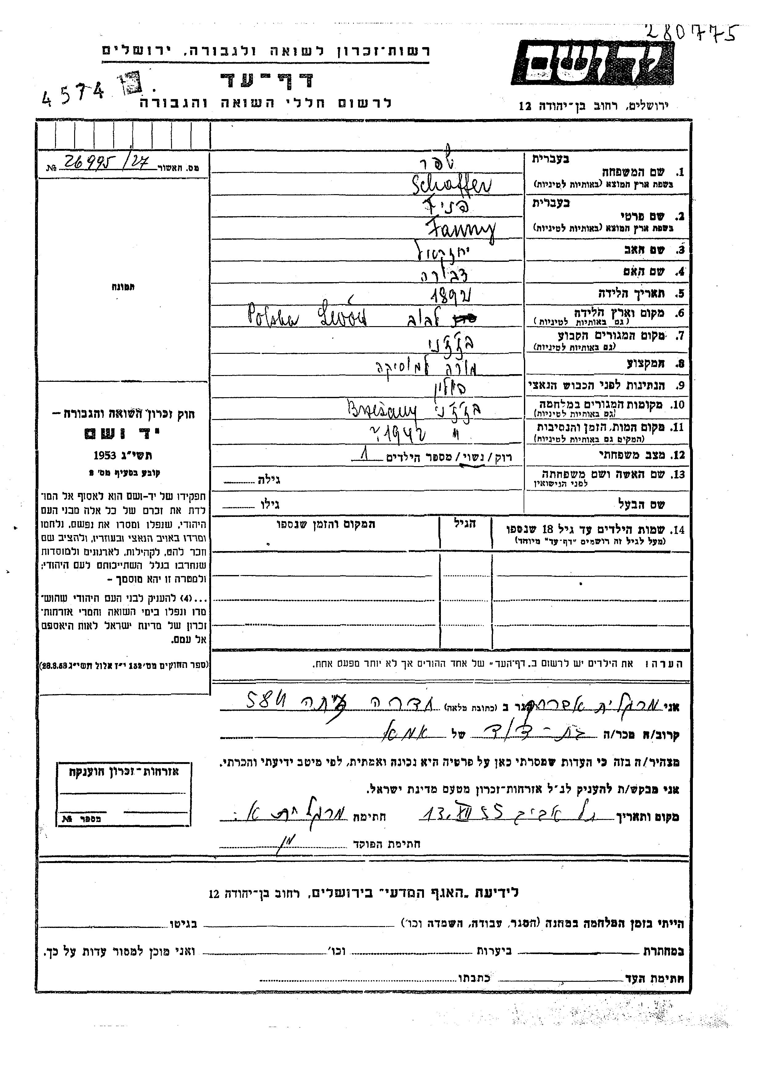 Fanny Schaffer wurde im Jahr 1892 in Lwow, Polen geboren. Sie war die Tochter von Yekhezkel und Dvora. Sie war Musiklehrer/-in und Verheiratet. Vor dem Zweiten Weltkrieg lebte sie in Brzezany, Polen. Während des Krieges war sie in Brzezany, Polen.