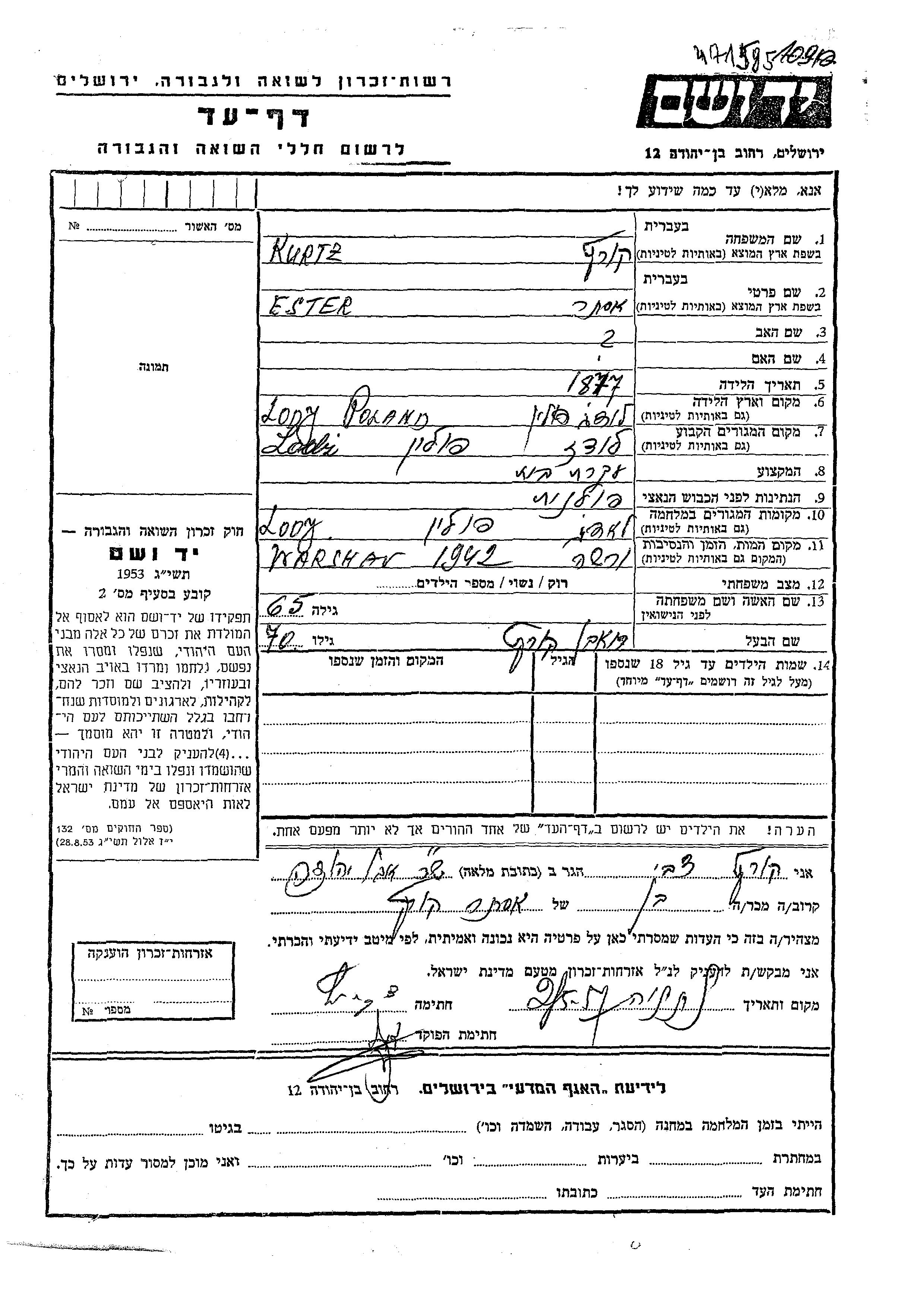Ester Kurtz wurde im Jahr 1877 in Lodz, Polen geboren. Sie war Hausfrau und mit Reuven Verheiratet. Vor dem Zweiten Weltkrieg lebte sie in Lodz, Polen. Während des Krieges war sie in Lodz, Polen.