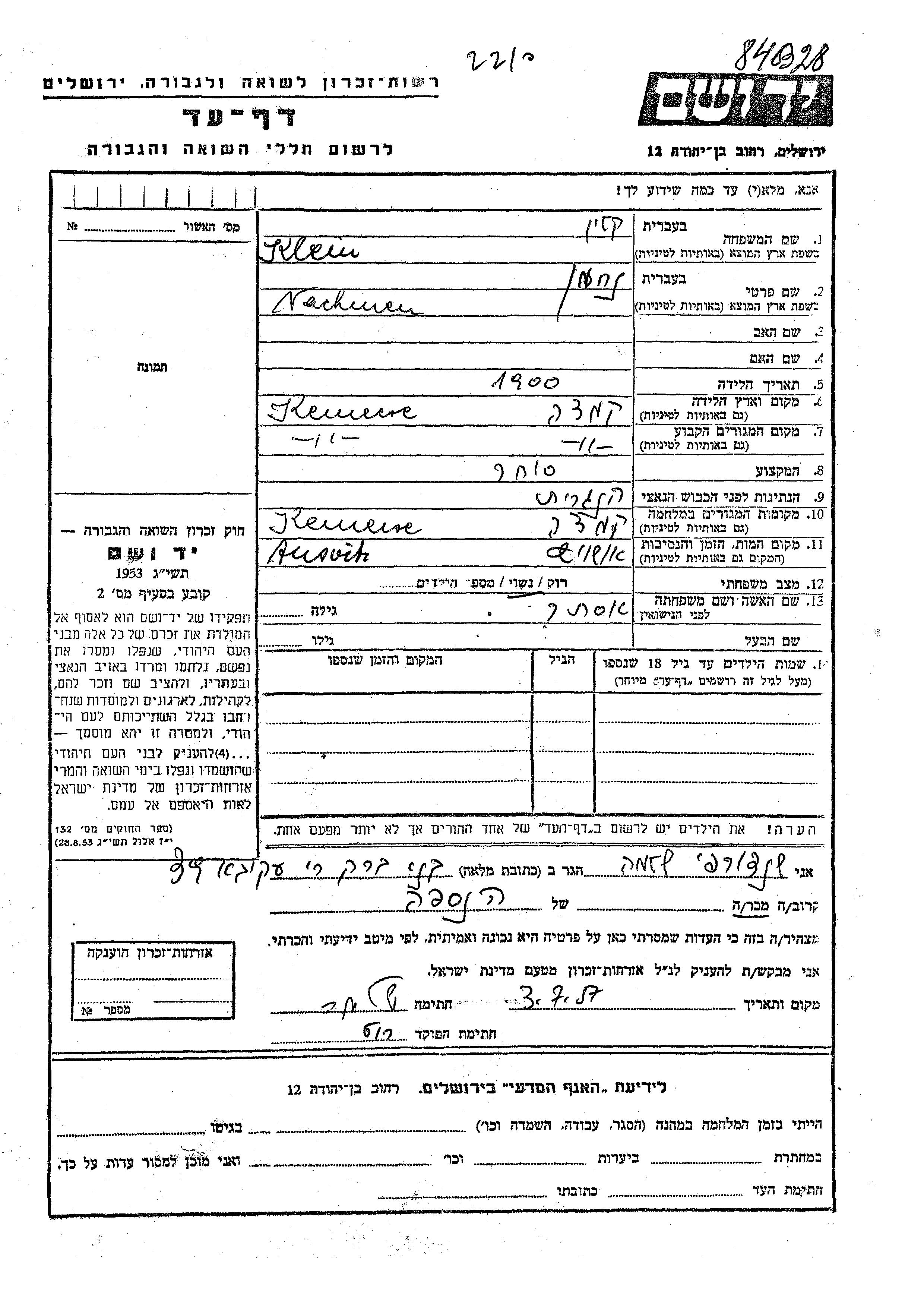 Nachmen Klein Kalin wurde im Jahr 1900 in Kemecse, Ungarn geboren. Er war Kaufmann/-frau und mit Ester Verheiratet. Vor dem Zweiten Weltkrieg lebte er in Kemecse, Ungarn. Während des Krieges war er in Kemecse, Ungarn.