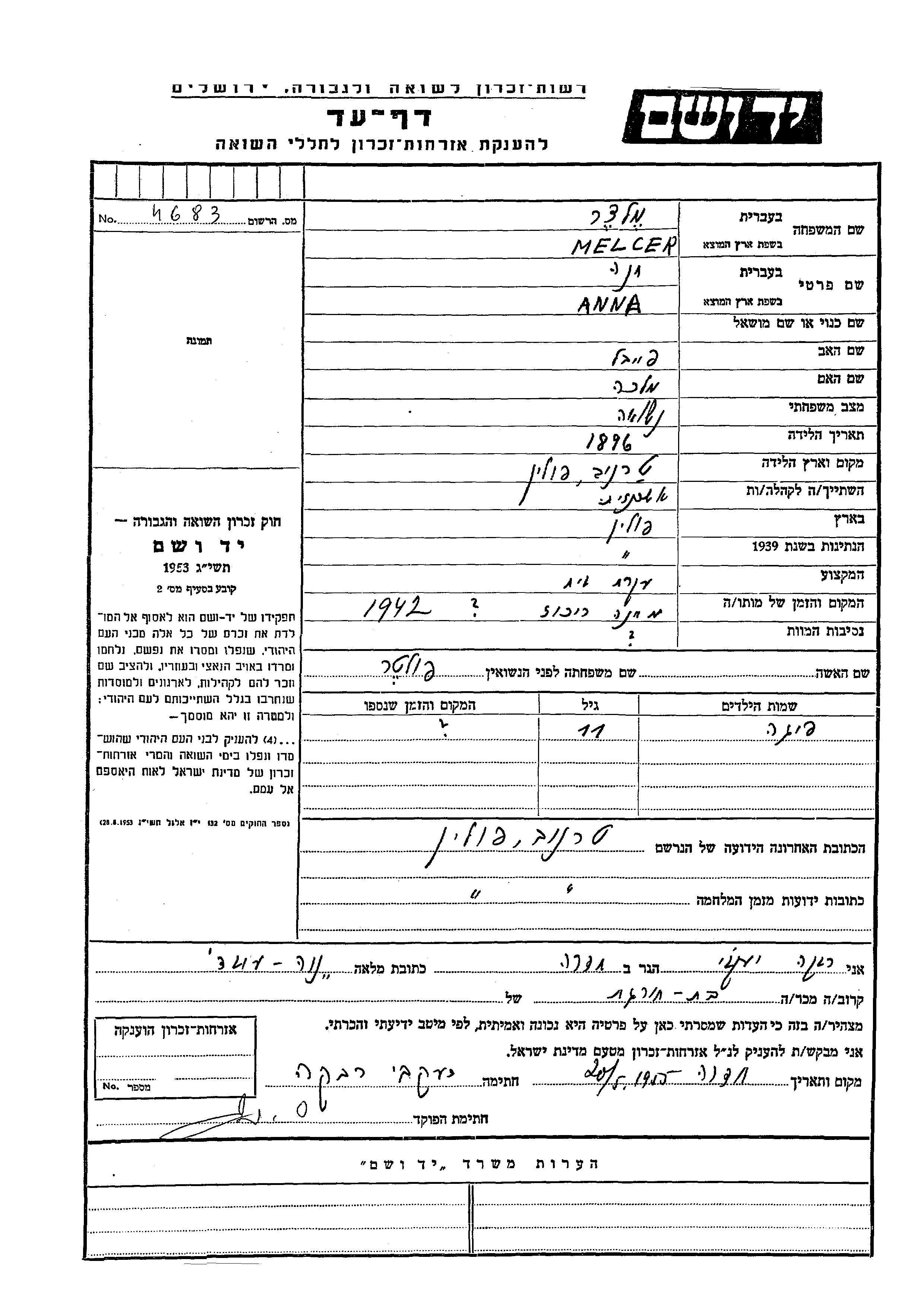 Anna Khana Melcer wurde im Jahr 1896 in Tarnow, Polen geboren. Sie war die Tochter von Faivel und Malka. Sie war Hausfrau und Verheiratet. Vor dem Zweiten Weltkrieg lebte sie in Polen. Während des Krieges war sie in Tarnow, Polen.