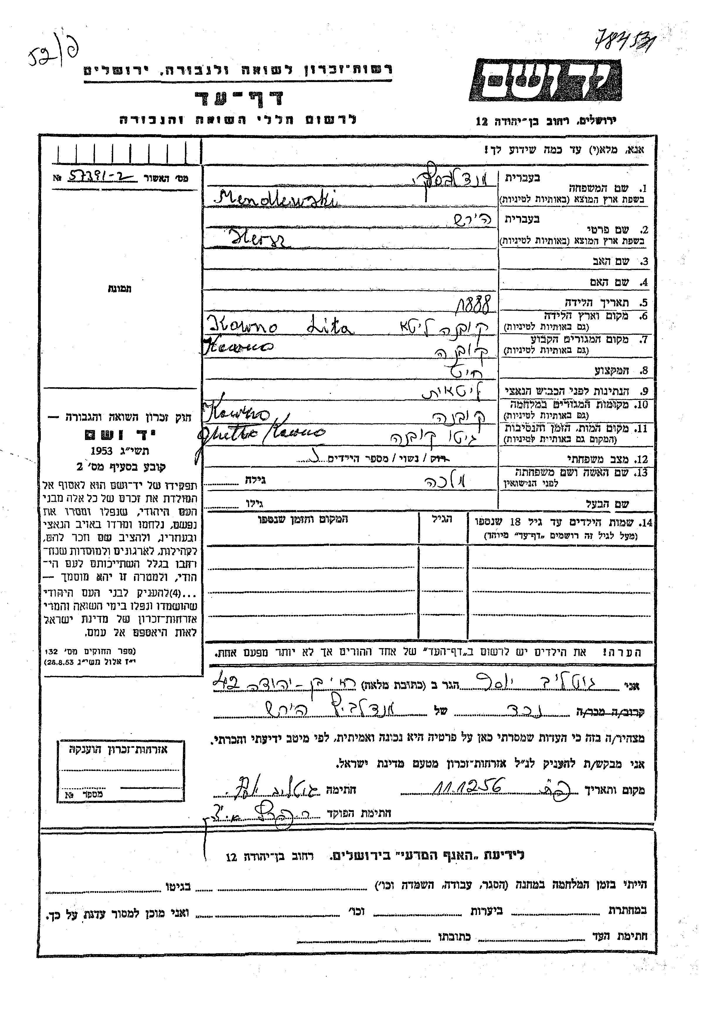 Hirs Mendelowski wurde im Jahr 1888 in Kovno, Litauen geboren. Er war Schneider und mit Malka Verheiratet. Vor dem Zweiten Weltkrieg lebte er in Kovno, Litauen. Während des Krieges war er in Kovno, Litauen.