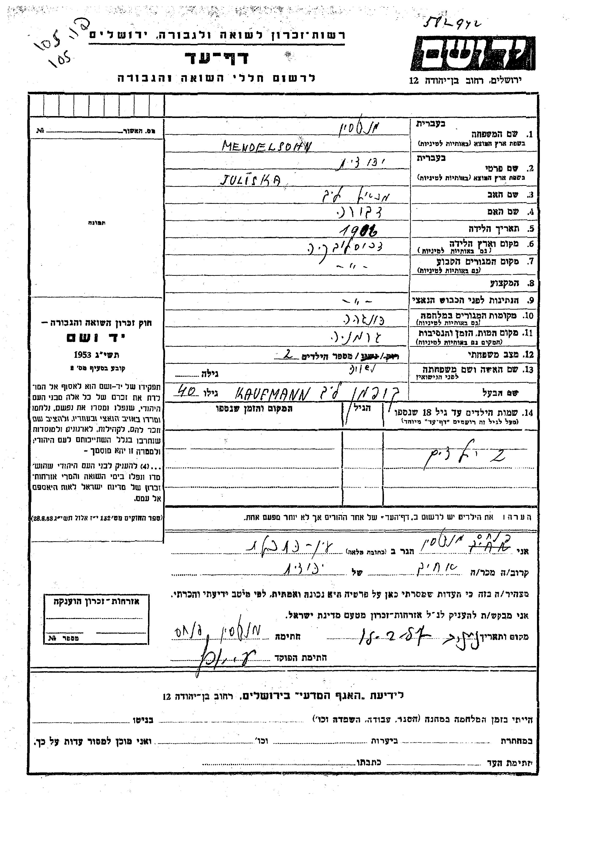 Juliska Yehudit Kaufmann, geb. Mendelsohn wurde im Jahr 1906 in Tschechoslowakei geboren. Sie war die Tochter von Mikhael Leib und Dvora. Sie war mit Leib Verheiratet. Vor dem Zweiten Weltkrieg lebte sie in Tschechoslowakei. Während des Krieges war sie in Ungarn.