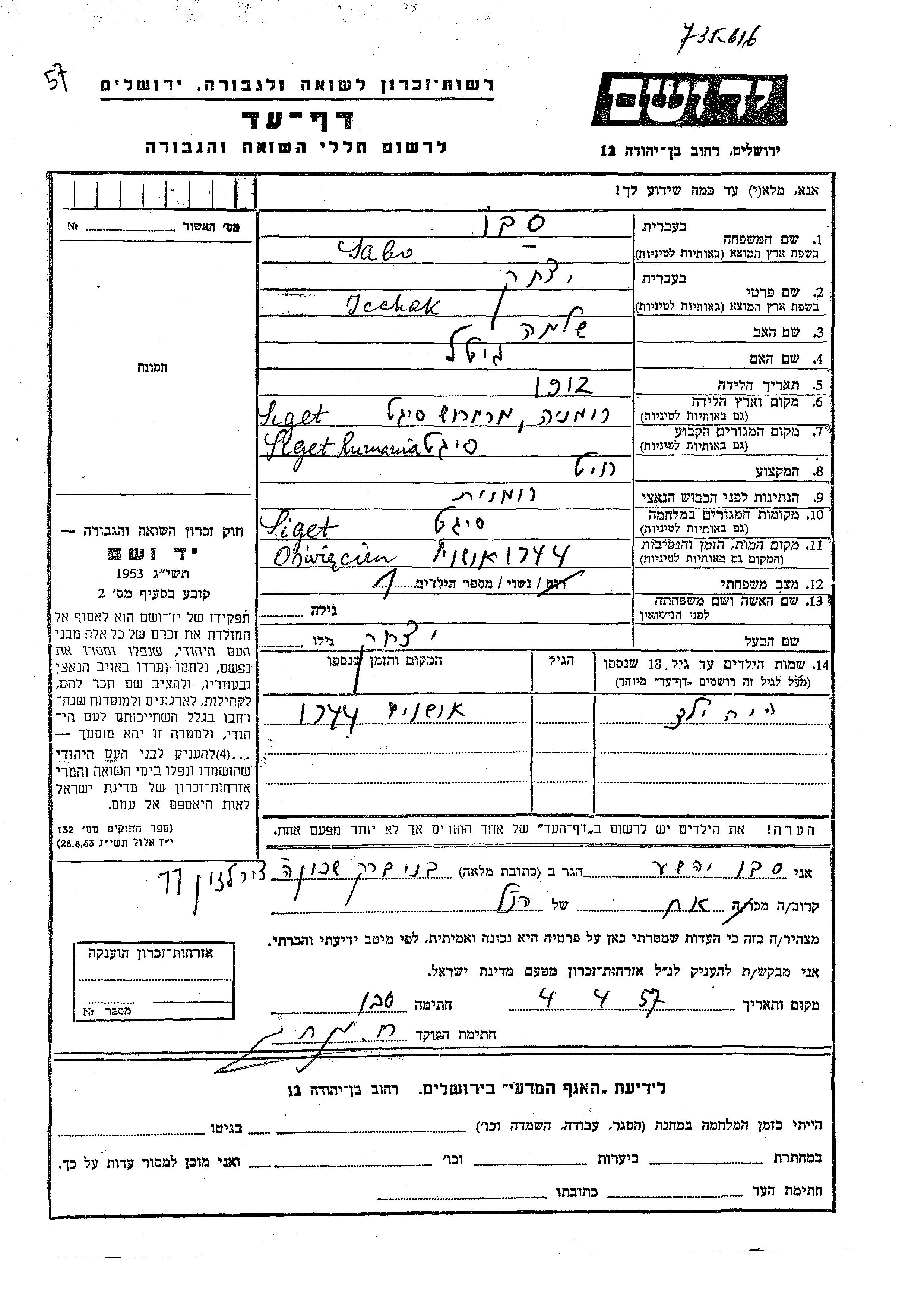 Icchak Sabo wurde im Jahr 1912 in Siget, Rumänien geboren. Er war der Sohn von Shlomo und Gitel. Er war Schneider und Verheiratet. Vor dem Zweiten Weltkrieg lebte er in Siget, Rumänien. Während des Krieges war er in Siget, Rumänien.