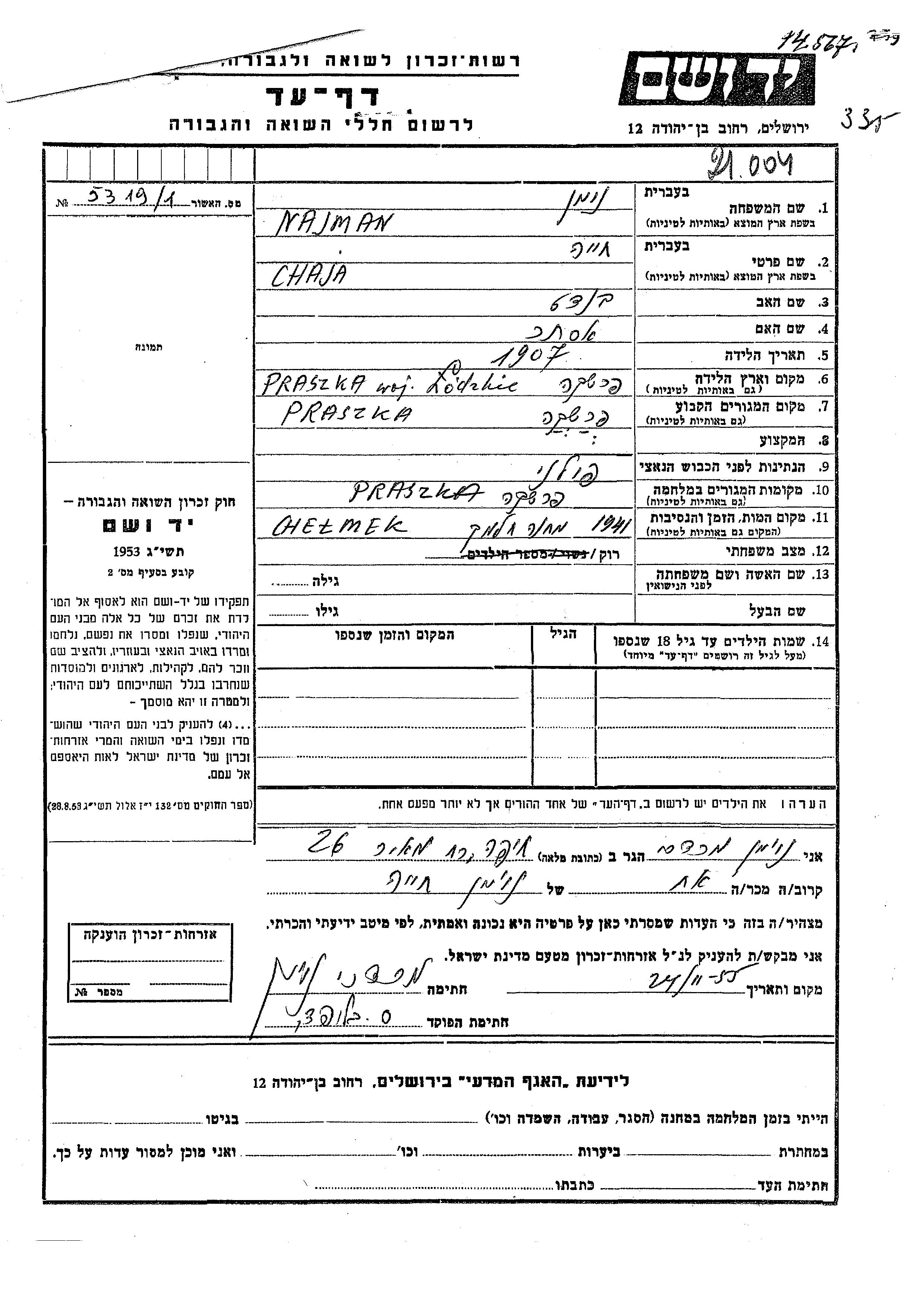 Chaja Najman Niman wurde im Jahr 1907 in Praszka, Polen geboren. Sie war die Tochter von Bendet und Ester. Sie war Ledig. Vor dem Zweiten Weltkrieg lebte sie in Praszka, Polen. Während des Krieges war sie in Praszka, Polen.