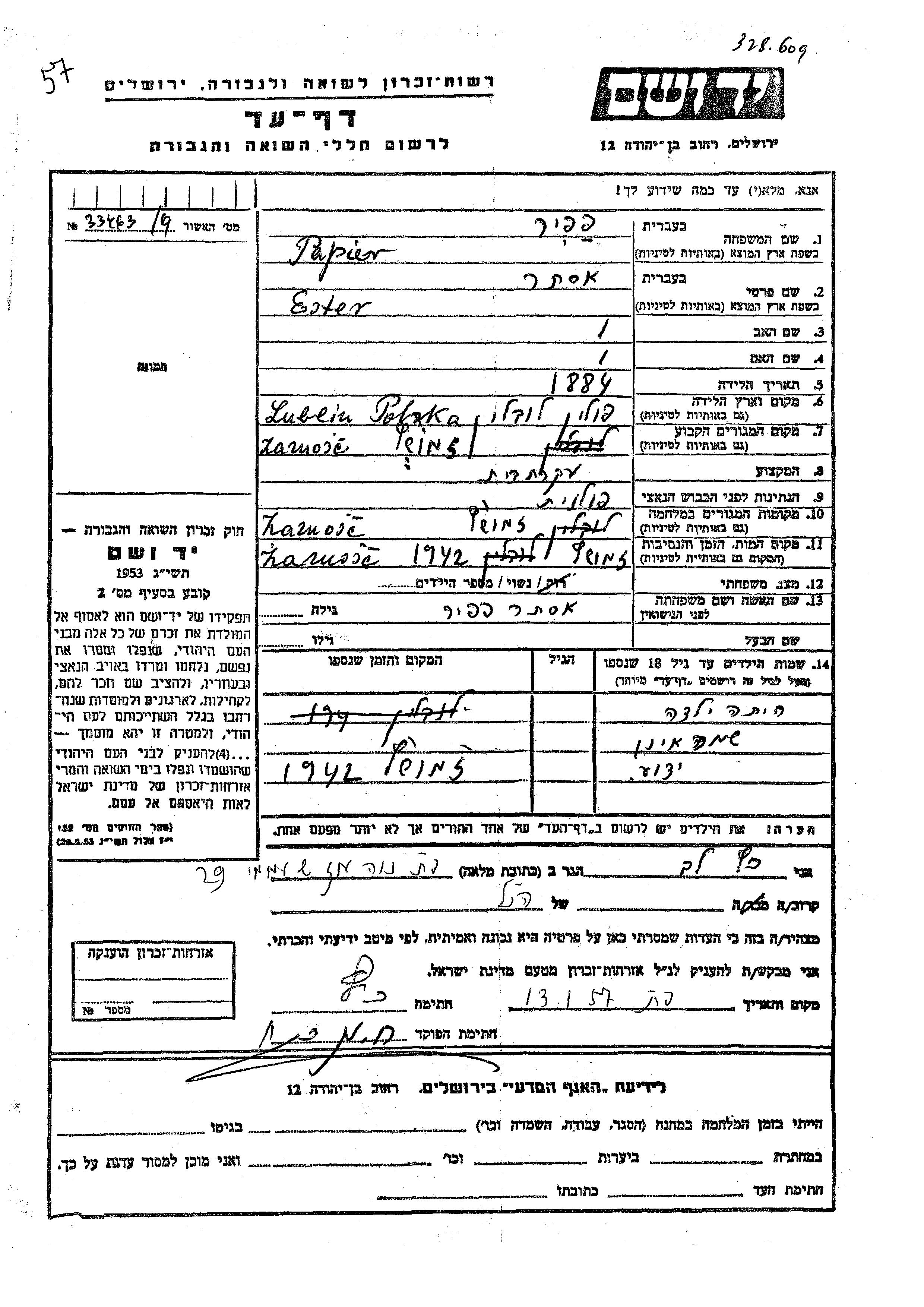 Ester wurde in der Schoah ermordet. Todesort: Zamosc, Polen im Jahr 1942.