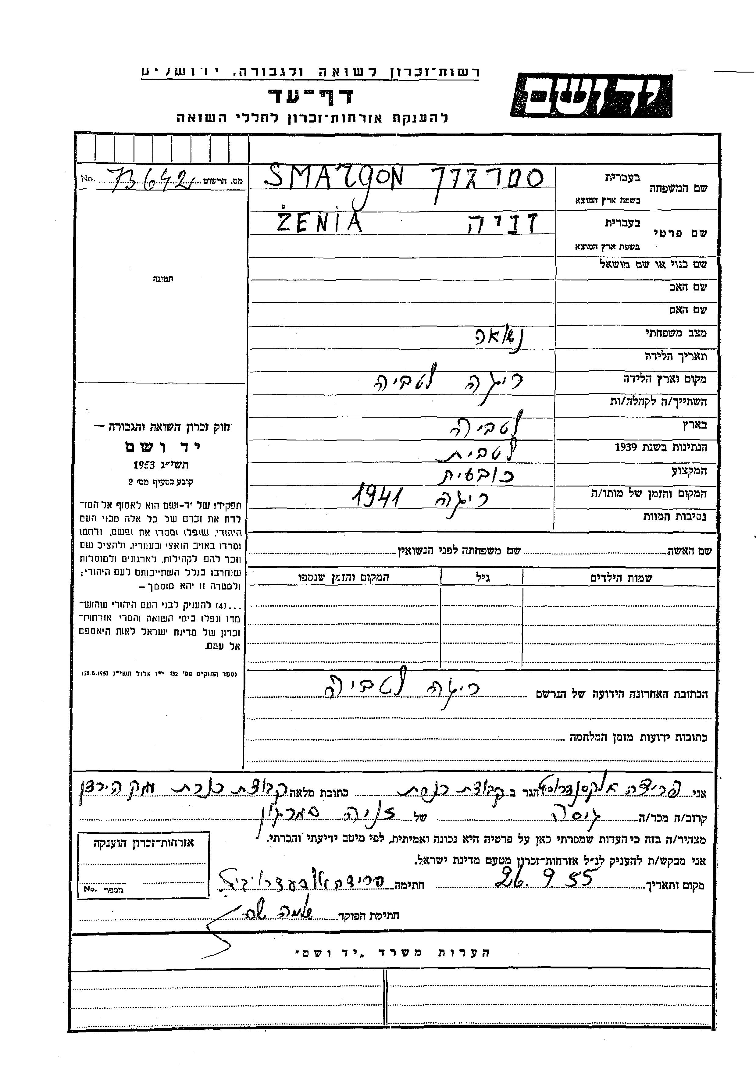 Zenia Smargon wurde in Riga, Lettland geboren. Sie war Hutmacher/-in. Während des Krieges war sie in Riga, Lettland.