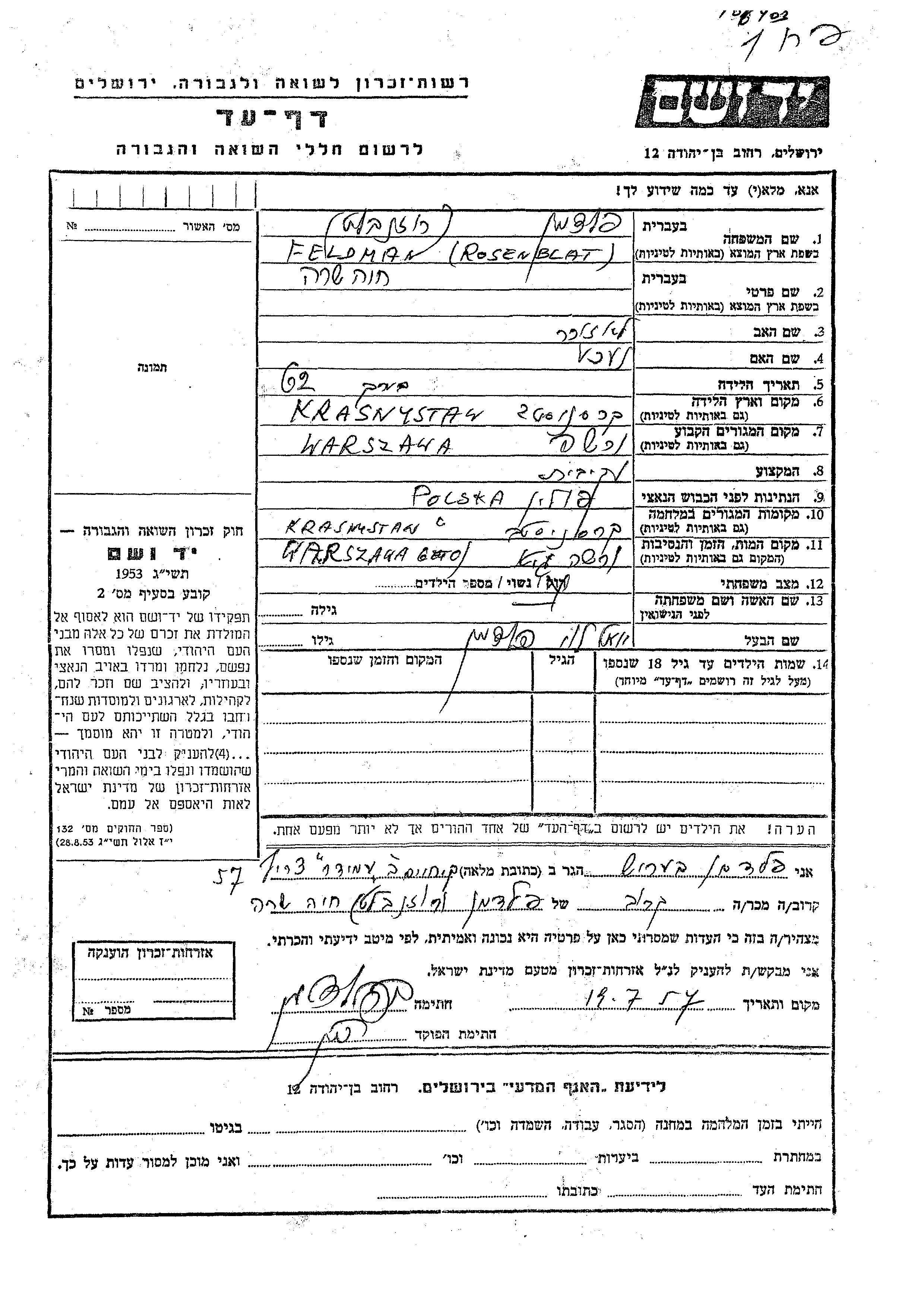 Khava Sara Feldman, geb. Rozenblat wurde in Krasnystaw, Polen geboren. Sie war die Tochter von Nekhe. Sie war Hausfrau und mit Yoel Levi Verheiratet. Vor dem Zweiten Weltkrieg lebte sie in Warsaw, Polen. Während des Krieges war sie in Krasnystaw, Polen.