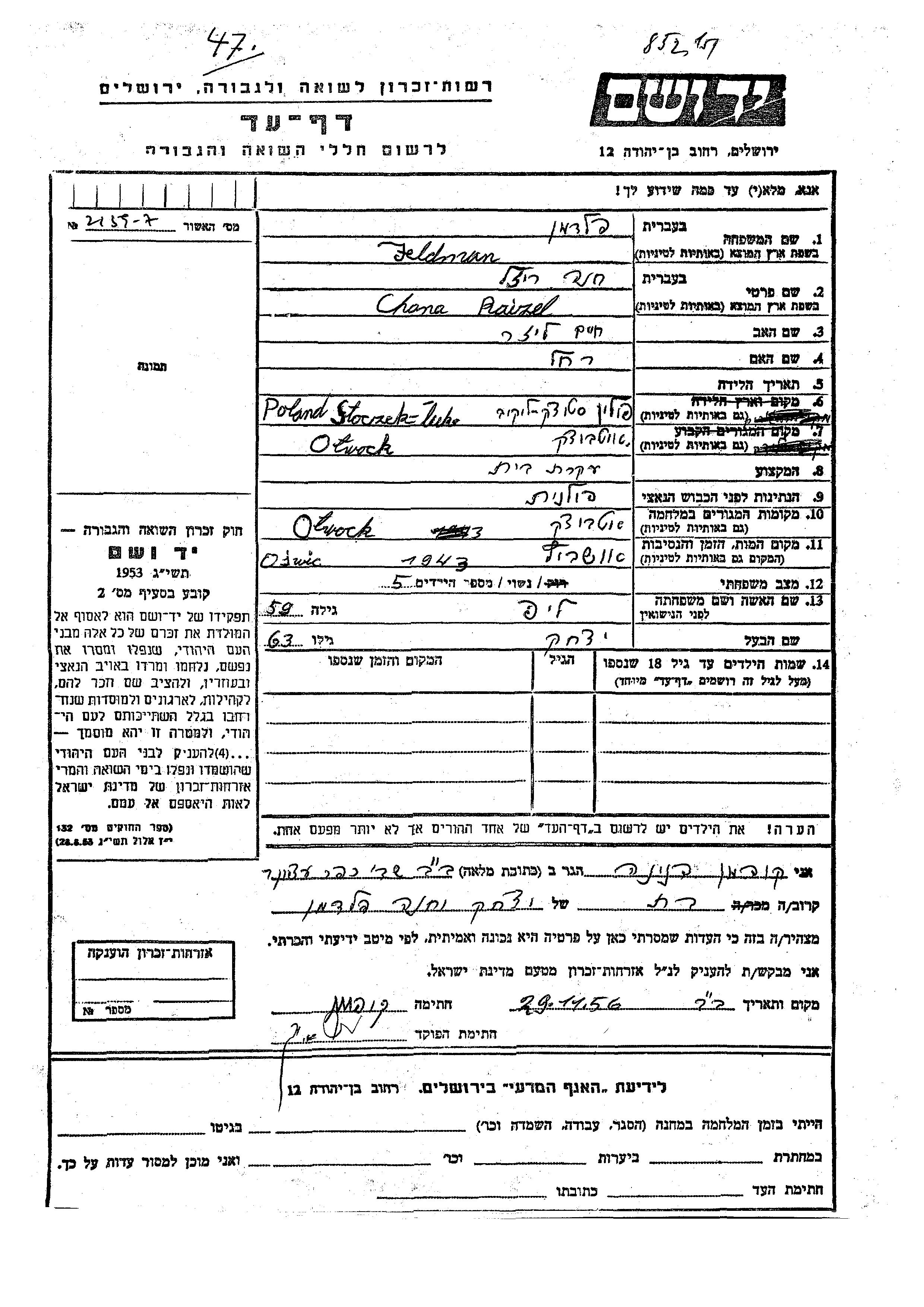Chana Raizel Feldman, geb. Lip wurde in Stoczek, Polen geboren. Sie war die Tochter von Khaim Eliezer und Rakhel. Sie war Hausfrau und mit Yitzkhak Verheiratet. Vor dem Zweiten Weltkrieg lebte sie in Otwock, Polen. Während des Krieges war sie in Otwock, Polen.