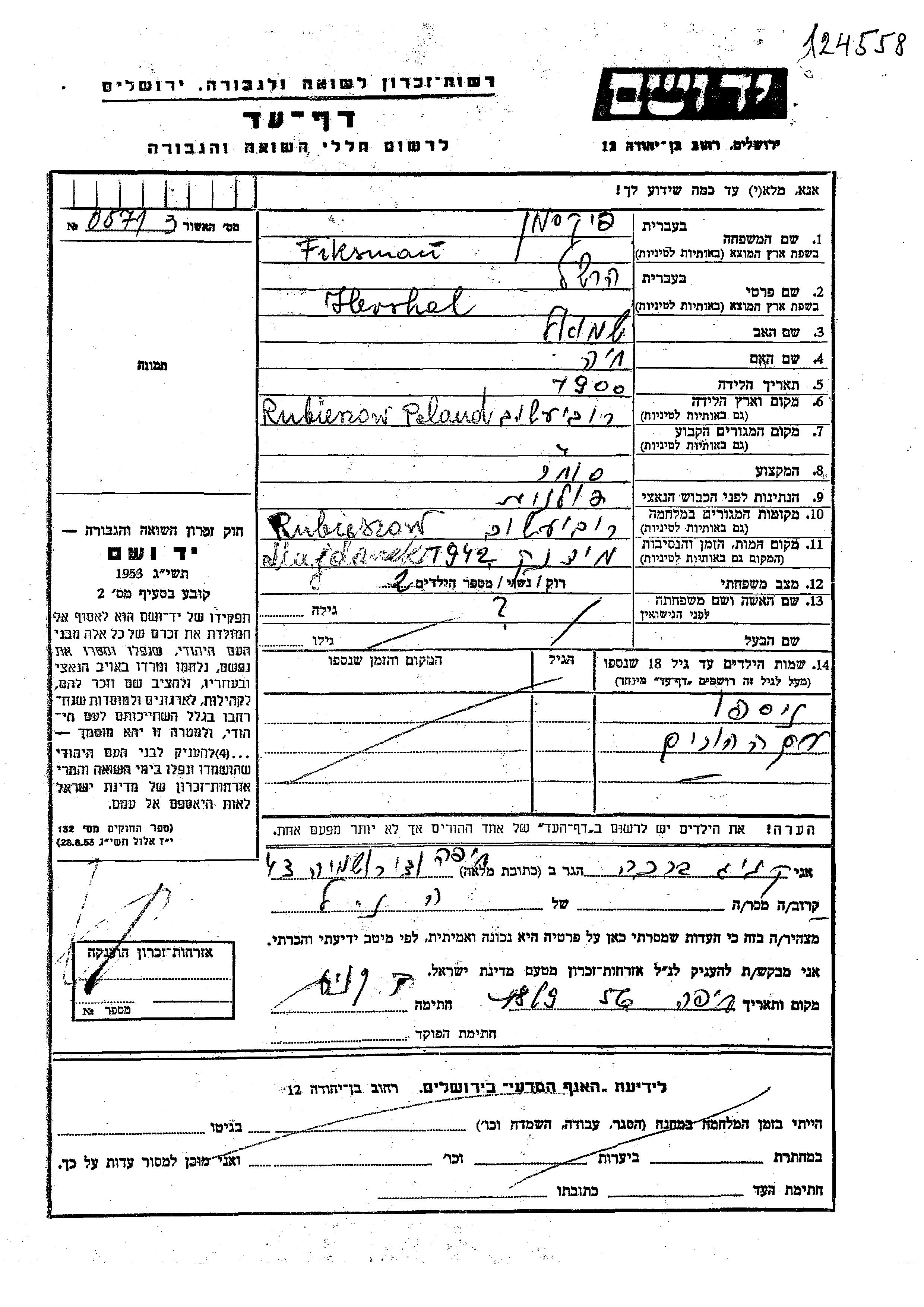 Hershel Fiksman wurde im Jahr 1900 in Rubieszow, Polen geboren. Er war der Sohn von Shmuel und Khaia. Er war Kaufmann/-frau und Verheiratet. Vor dem Zweiten Weltkrieg lebte er in Rubieszow, Polen. Während des Krieges war er in Rubieszow, Polen.