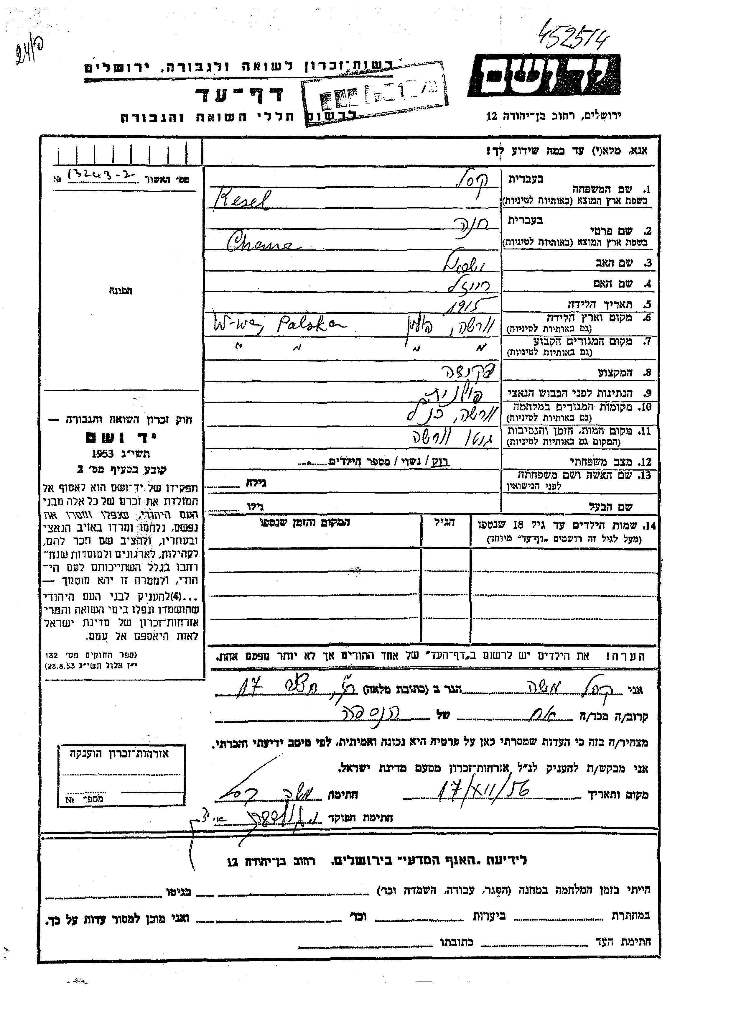 Chana Kesel wurde im Jahr 1915 in Varsha, Polen geboren. Sie war die Tochter von Yisrael und Reizl. Sie war Angestellte/-r und Ledig. Vor dem Zweiten Weltkrieg lebte sie in Varsha, Polen. Während des Krieges war sie in Varsha, Polen.