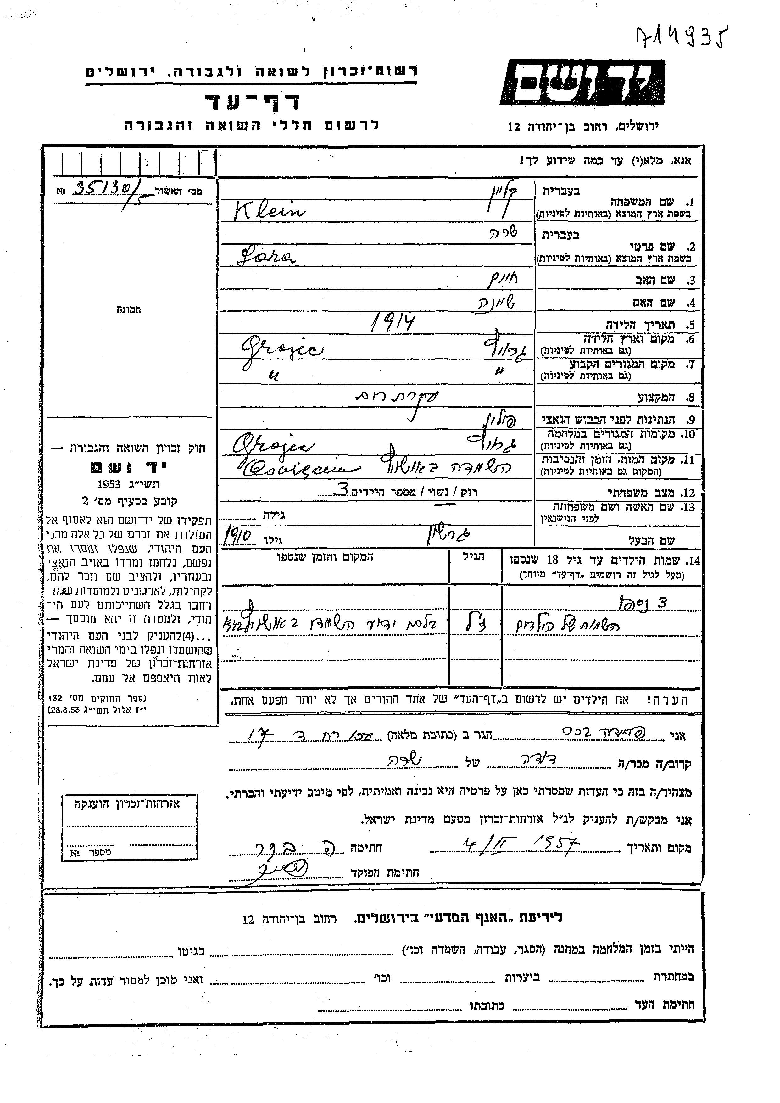 Sara Klein wurde im Jahr 1914 in Grojec, Polen geboren. Sie war die Tochter von Khaim und Sheina. Sie war Hausfrau und mit Gershon Verheiratet. Vor dem Zweiten Weltkrieg lebte sie in Grojec, Polen. Während des Krieges war sie in Grojec, Polen.