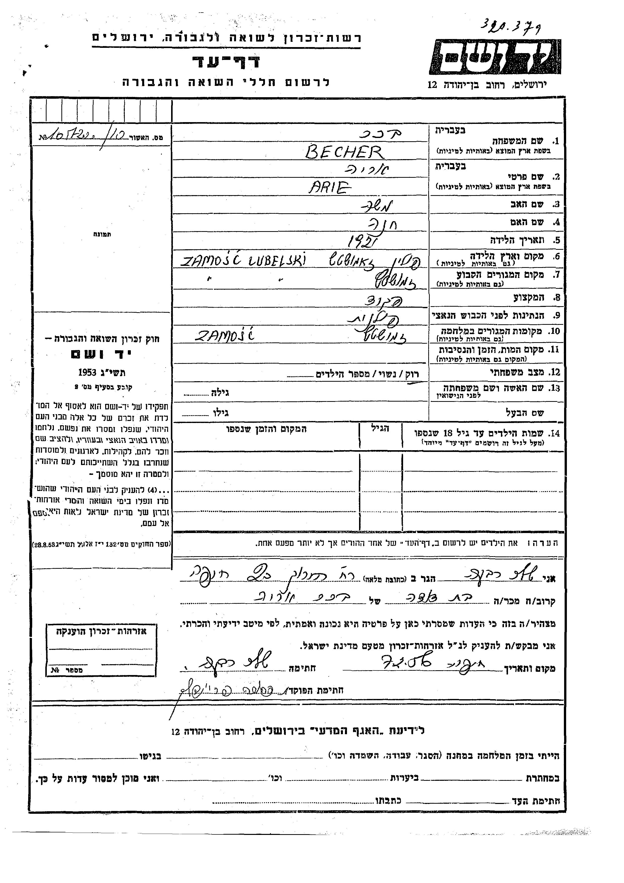 Arie Becher wurde im Jahr 1921 in Zamosc, Polen geboren. Er war der Sohn von Moshe und Khana. Er war Angestellte/-r und Ledig. Vor dem Zweiten Weltkrieg lebte er in Zamosc, Polen. Während des Krieges war er in Zamosc, Polen.
