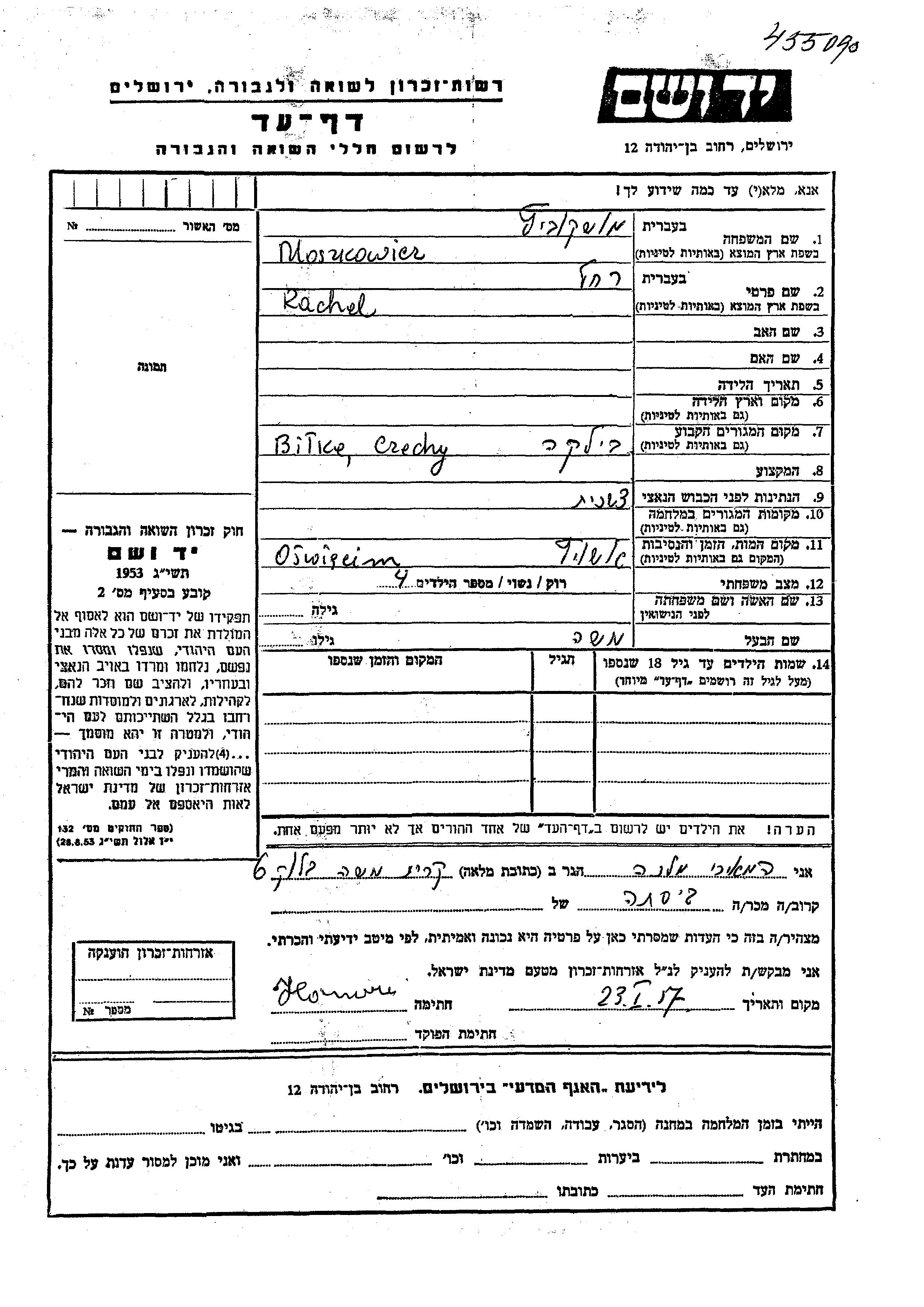 Rachel Moszkowicz. Sie war mit Moshe Verheiratet. Vor dem Zweiten Weltkrieg lebte sie in Bilka, Tschechoslowakei.