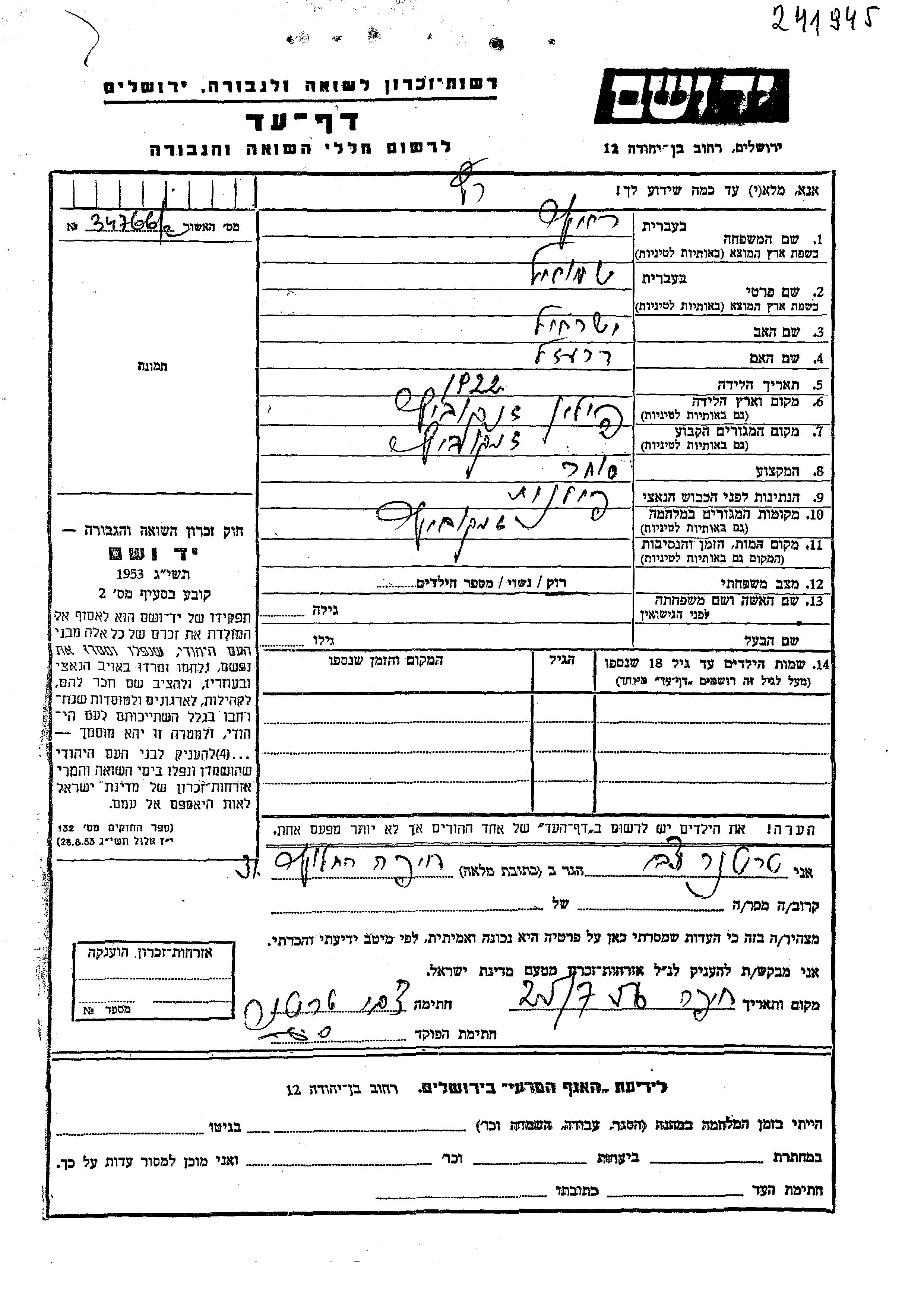 Shmuel Ratz wurde im Jahr 1922 in Zankowice, Polen geboren. Er war der Sohn von Yisrael und Dreiza. Er war Kaufmann/-frau und Ledig. Vor dem Zweiten Weltkrieg lebte er in Zankowice, Polen. Während des Krieges war er in Zankowice, Polen.