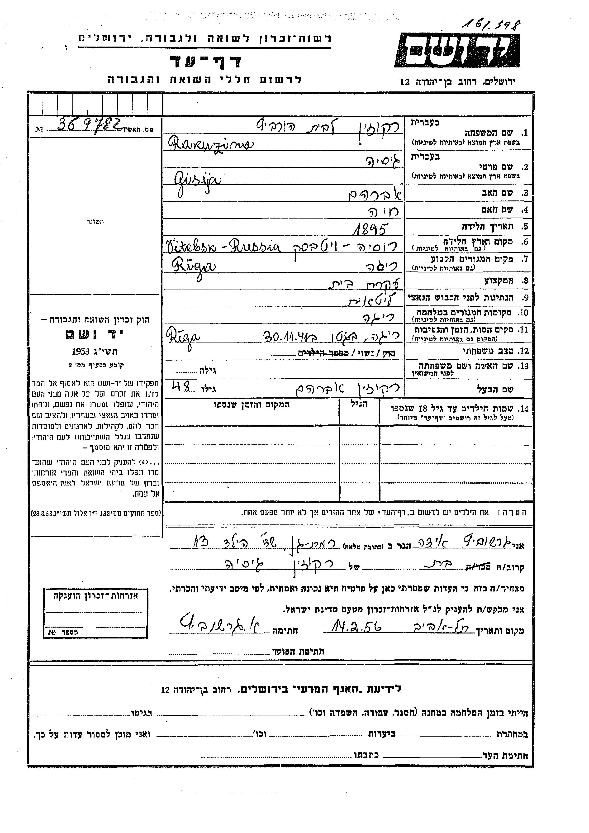 Gisia Rakuzin, geb. Hurvitz wurde im Jahr 1895 in Vitebsk, Weißrussland (UdSSR) geboren. Sie war die Tochter von Avraham und Khaia. Sie war Hausfrau und mit Avraham Verheiratet. Vor dem Zweiten Weltkrieg lebte sie in Riga, Lettland. Während des Krieges war sie in Riga, Lettland.