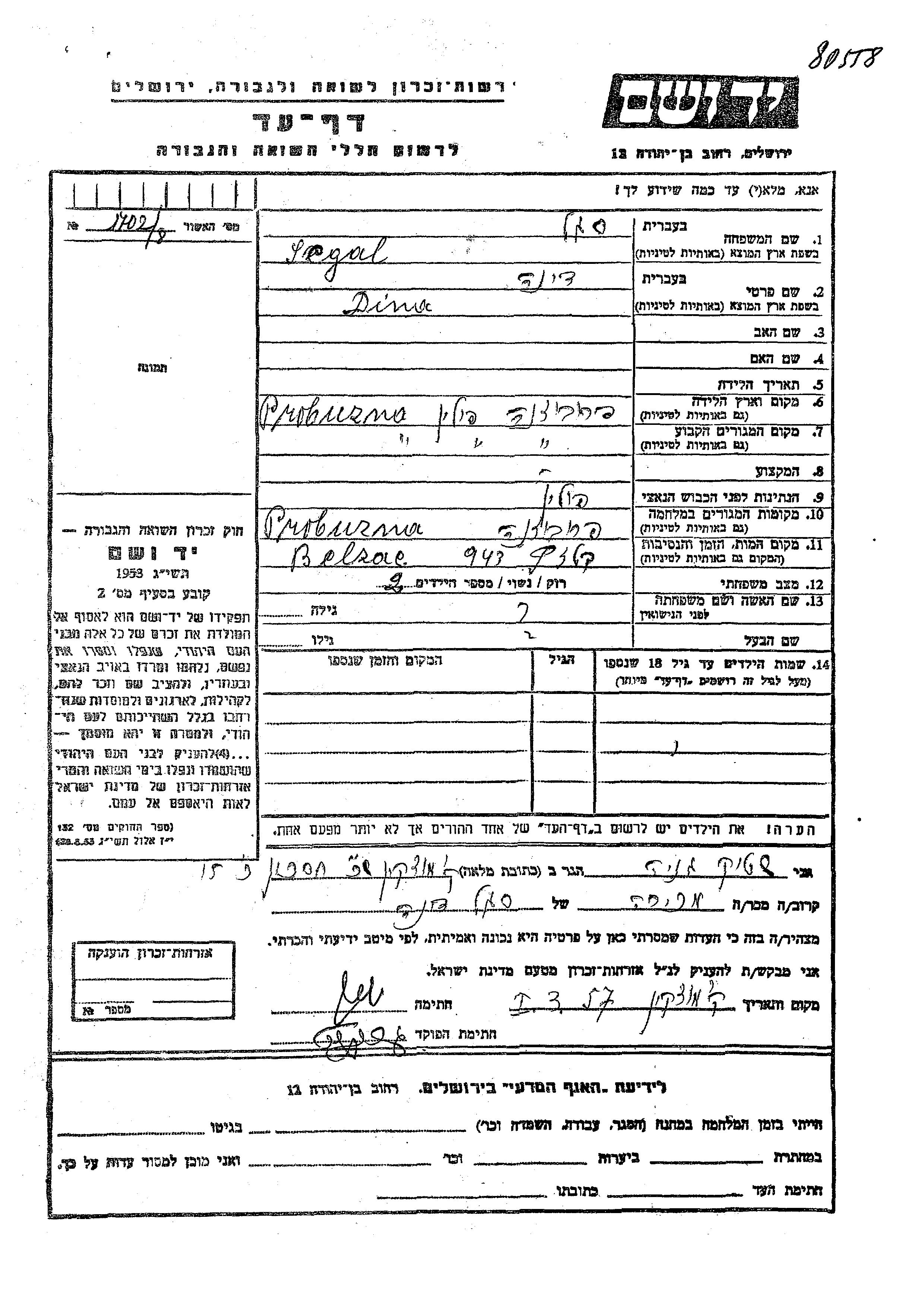 Dina Segal wurde in Probuzna, Polen geboren. Sie war Verheiratet. Vor dem Zweiten Weltkrieg lebte sie in Probuzna, Polen. Während des Krieges war sie in Probuzna, Polen.