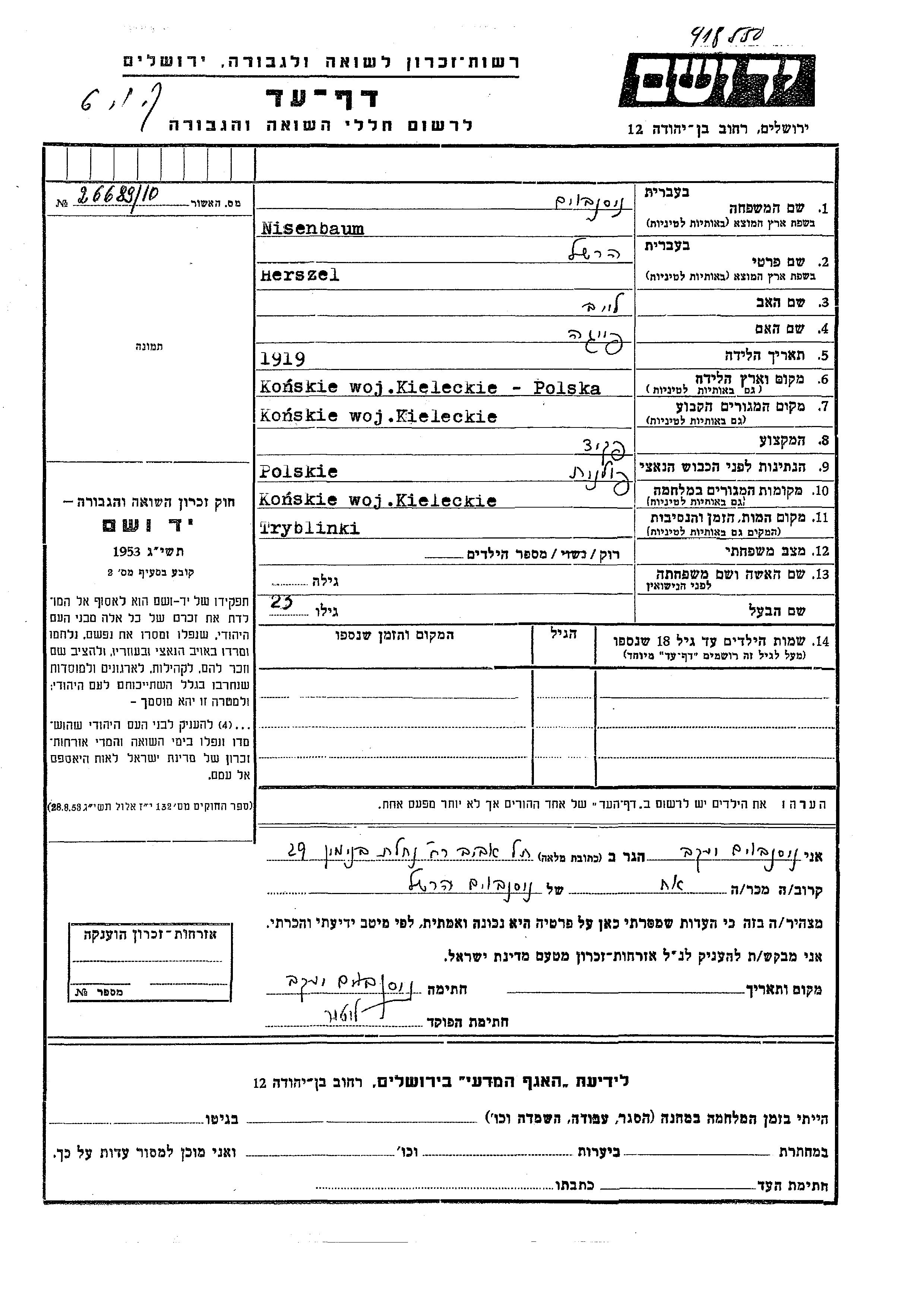 Herszel Nusenbaum wurde im Jahr 1919 in Konskie, Polen geboren. Er war der Sohn von Leib und Feiga. Er war Angestellte/-r. Vor dem Zweiten Weltkrieg lebte er in Konskie, Polen. Während des Krieges war er in Konskie, Polen.