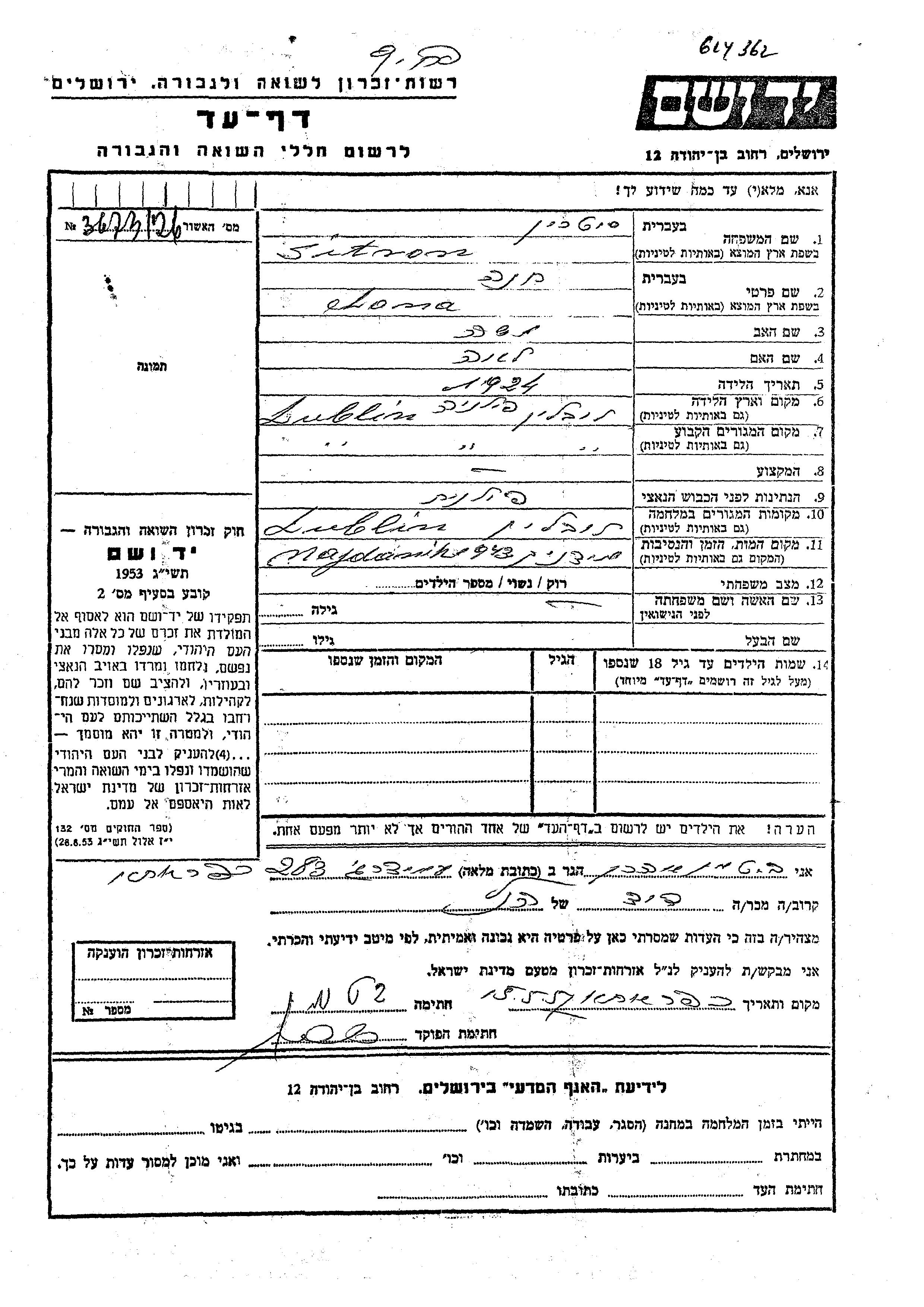 Sitron Chana 1924 Lublin, Polen Gedenkblatt