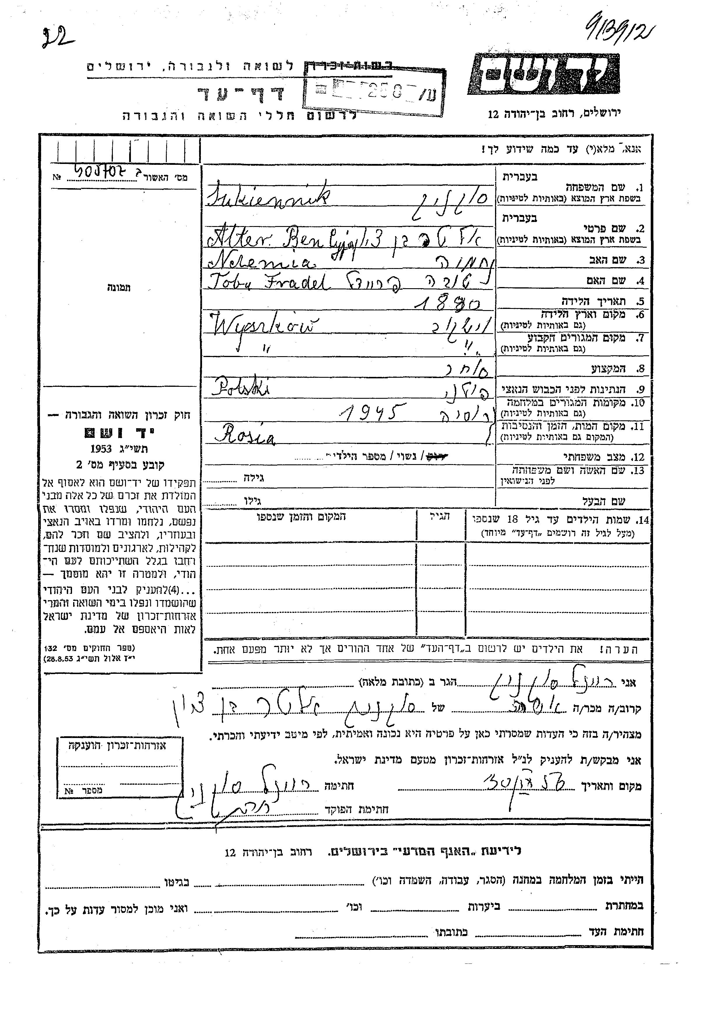 Ben Cyjon Alter Sukiennik wurde im Jahr 1880 in Wiszkow, Polen geboren. Er war der Sohn von Nehemia und Toba Fradel Tova Freidel. Er war Kaufmann/-frau und Verheiratet. Vor dem Zweiten Weltkrieg lebte er in Wyszkow, Polen. Während des Krieges war er in Russland (UdSSR).
