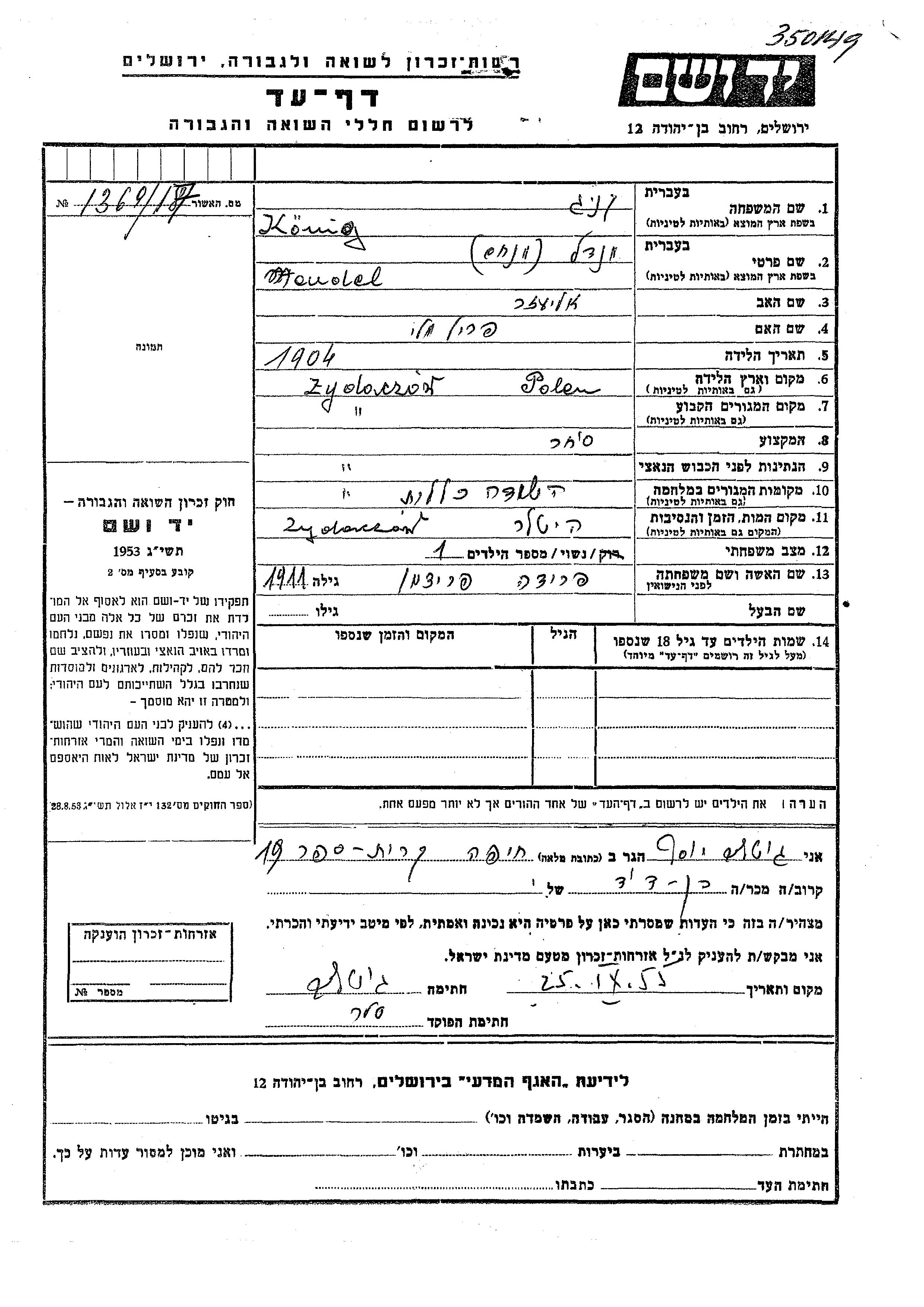 Mendel Menakhem Konig wurde im Jahr 1904 in Zydaczow, Polen geboren. Er war der Sohn von Eliezer und Peril Mali. Er war Kaufmann/-frau und mit Frida, geb. Fridman Verheiratet. Vor dem Zweiten Weltkrieg lebte er in Zydaczow, Polen. Während des Krieges war er in Zydaczow, Polen.