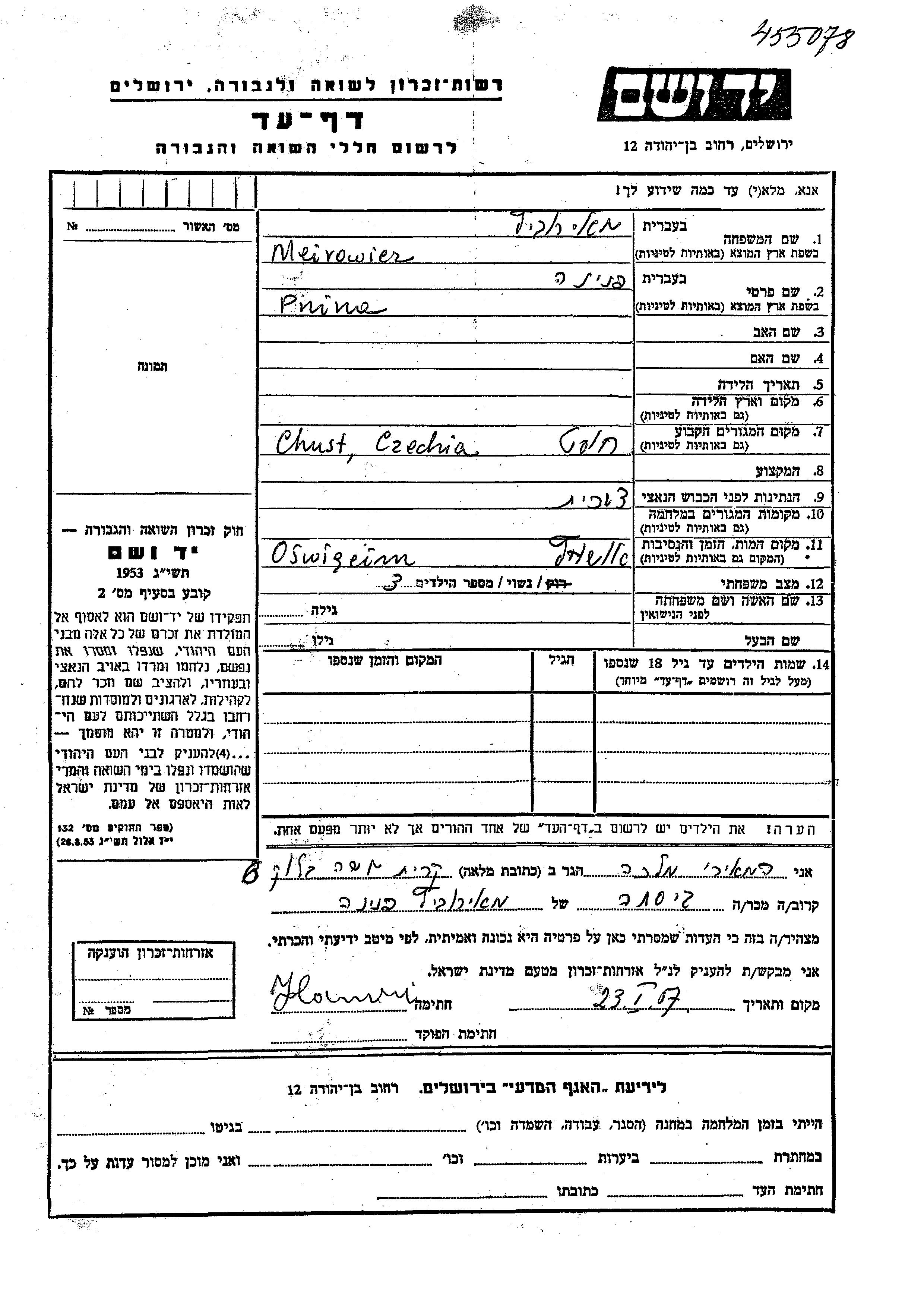 Meirowicz Pnina Nina Chust, Tschechoslowakei Gedenkblatt