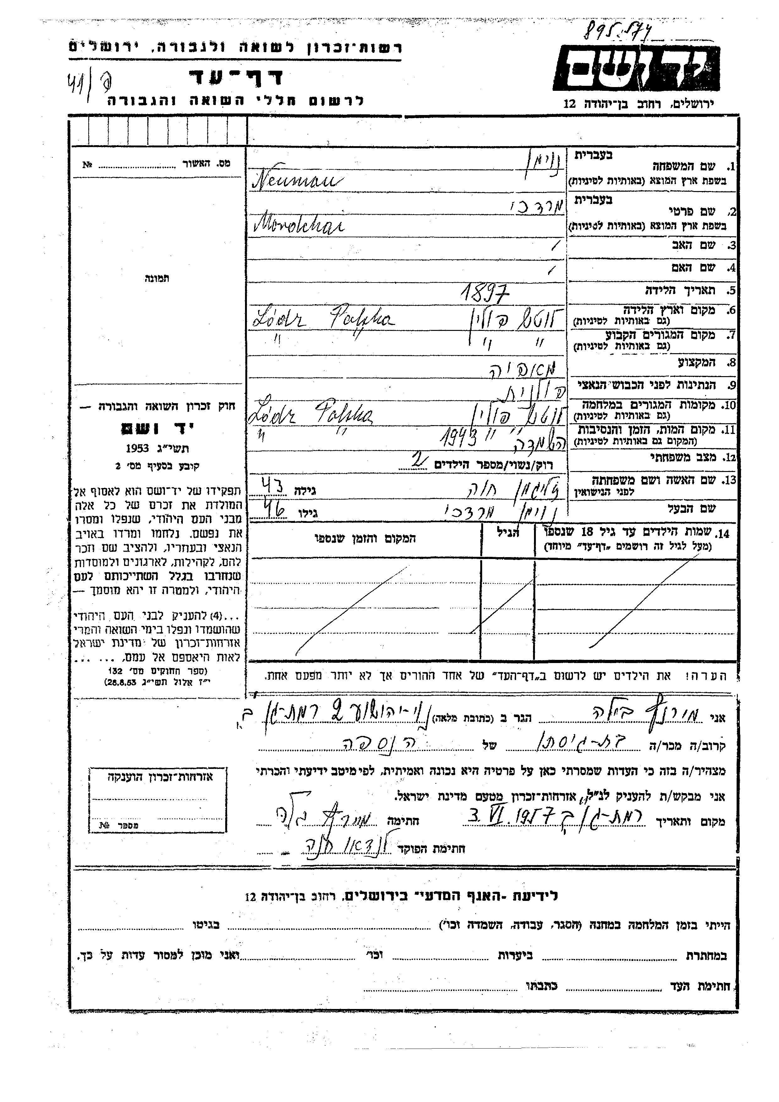 Mordchai Neuman wurde im Jahr 1897 in Lodz, Polen geboren. Er war mit Khava, geb. Zeligman Verheiratet. Vor dem Zweiten Weltkrieg lebte er in Lodz, Polen. Während des Krieges war er in Lodz, Polen.