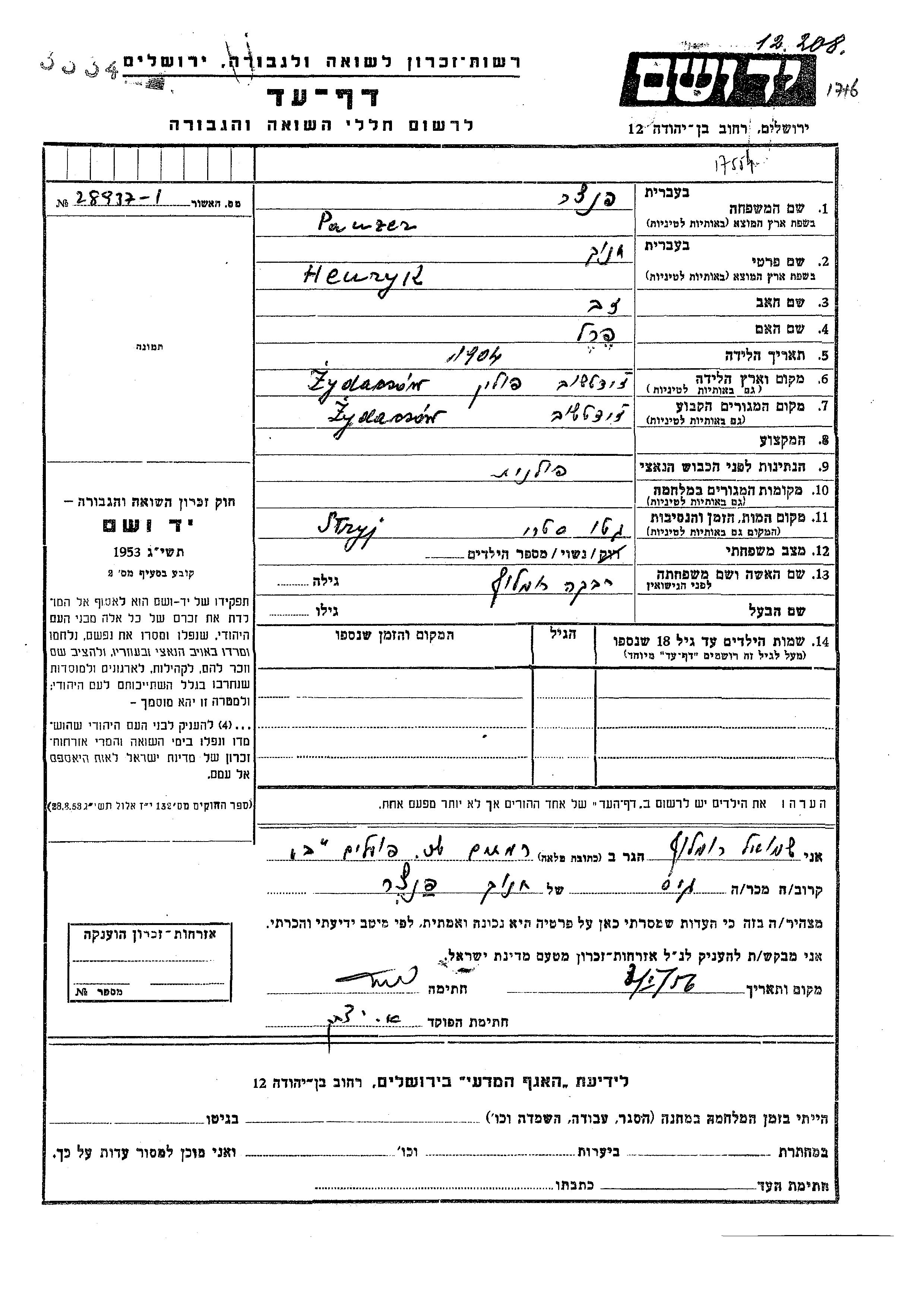 Henryk Panzer Pantzer wurde im Jahr 1904 in Zydaczow, Polen geboren. Er war der Sohn von Zeev und Perel. Er war mit Rivka, geb. Rumlauf Verheiratet. Vor dem Zweiten Weltkrieg lebte er in Zydaczow, Polen.