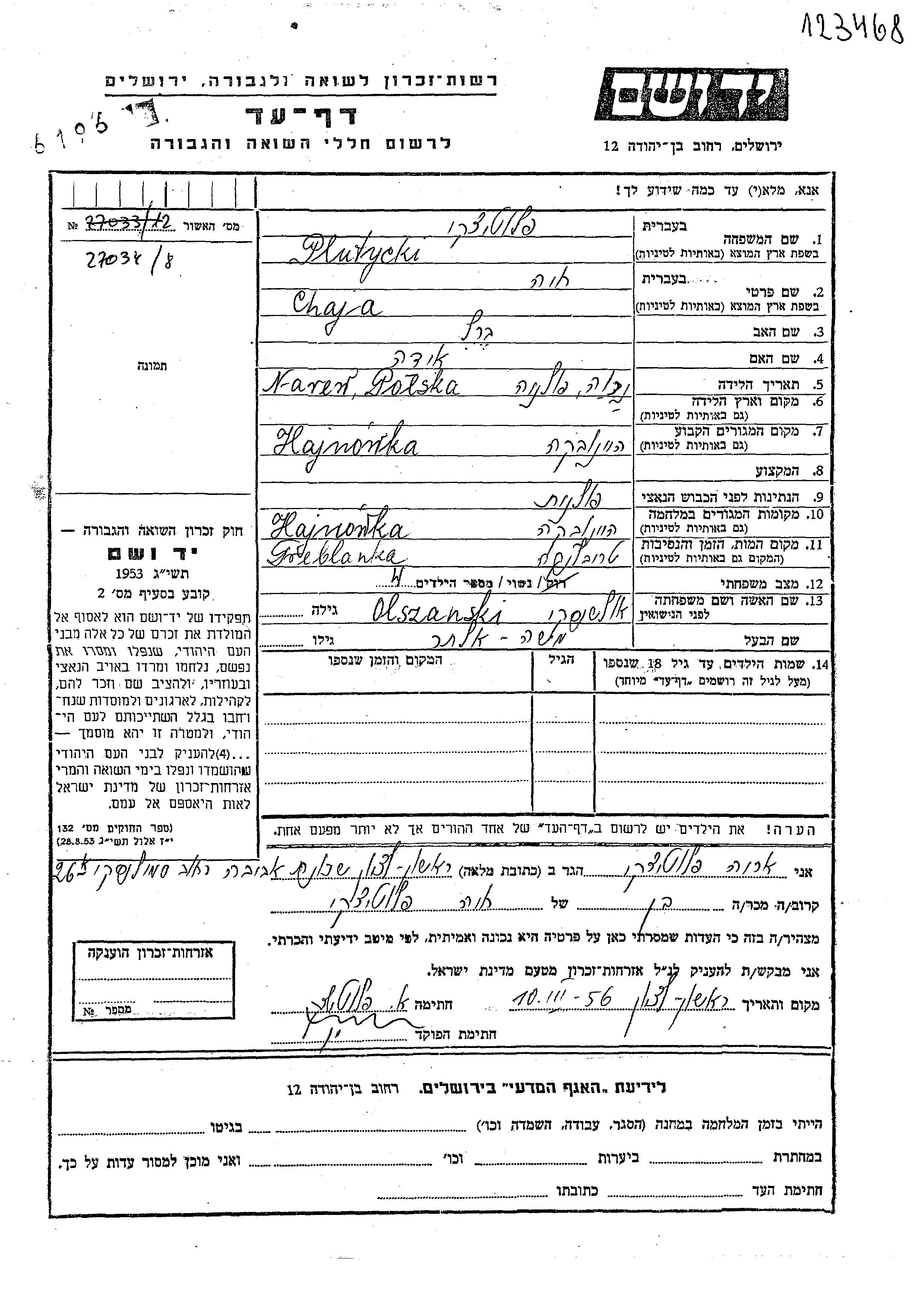 Chaja Plutycki, geb. Olszanski wurde in Narew, Polen geboren. Sie war die Tochter von Berl und Ida. Sie war mit Moshe Alter Verheiratet. Vor dem Zweiten Weltkrieg lebte sie in Hajnówka, Polen. Während des Krieges war sie in Hajnówka, Polen.
