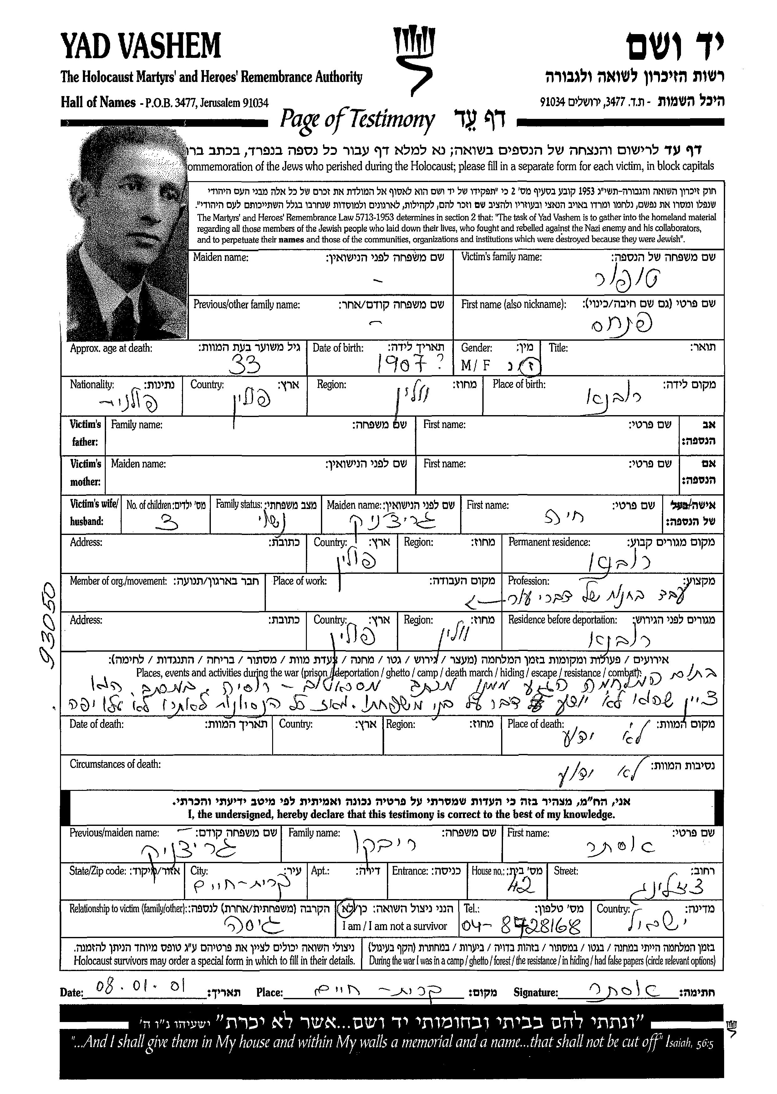Topor Pinkhas 1907 Rowna, Polen Gedenkblatt