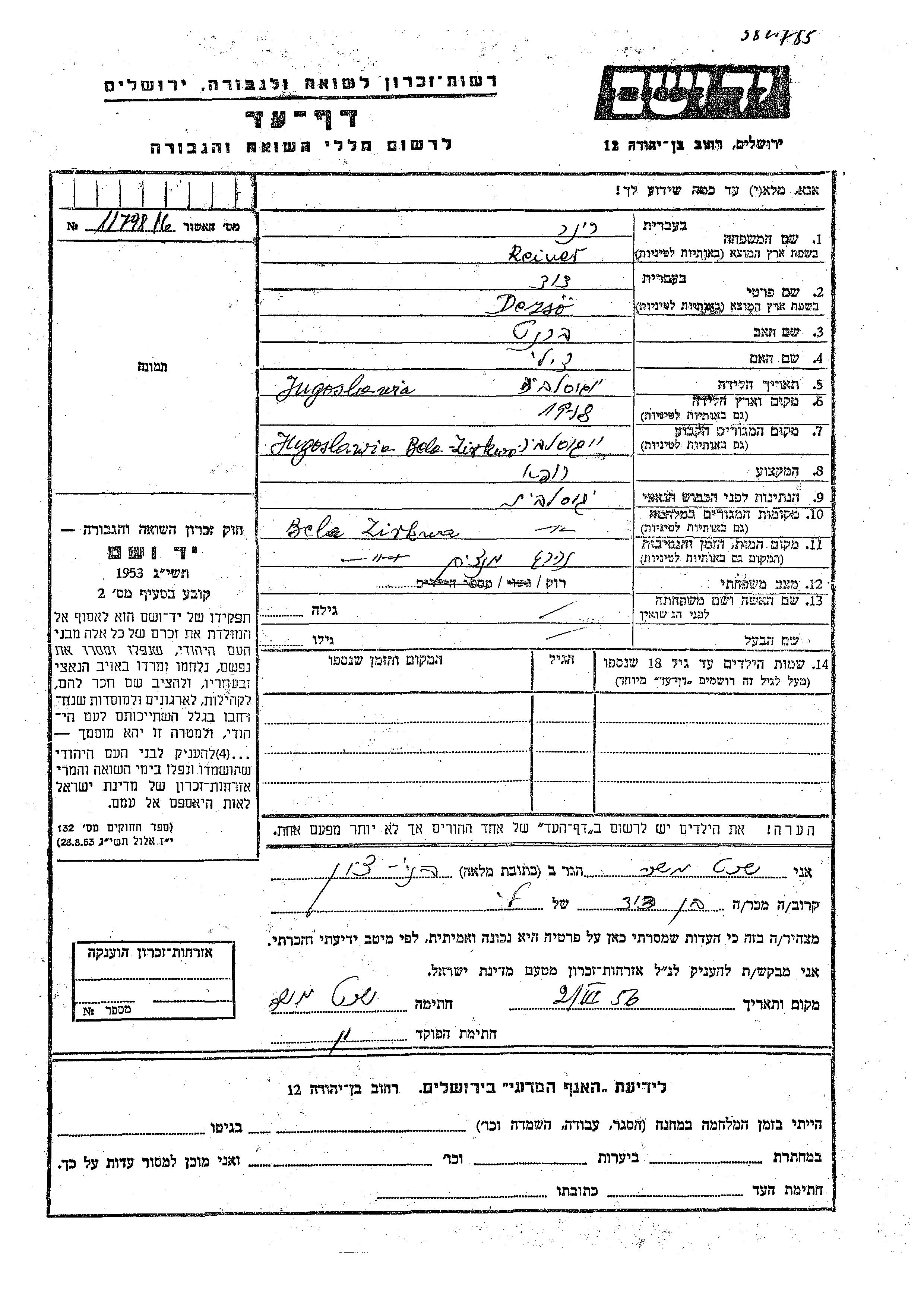 Dezso David Reiner Riner wurde im Jahr 1918 in Jugoslawien geboren. Er war der Sohn von Bernat und Tzili. Er war Arzt/ärztin und Ledig. Vor dem Zweiten Weltkrieg lebte er in Bela Crkva, Jugoslawien. Während des Krieges war er in Bela Crkva, Jugoslawien.