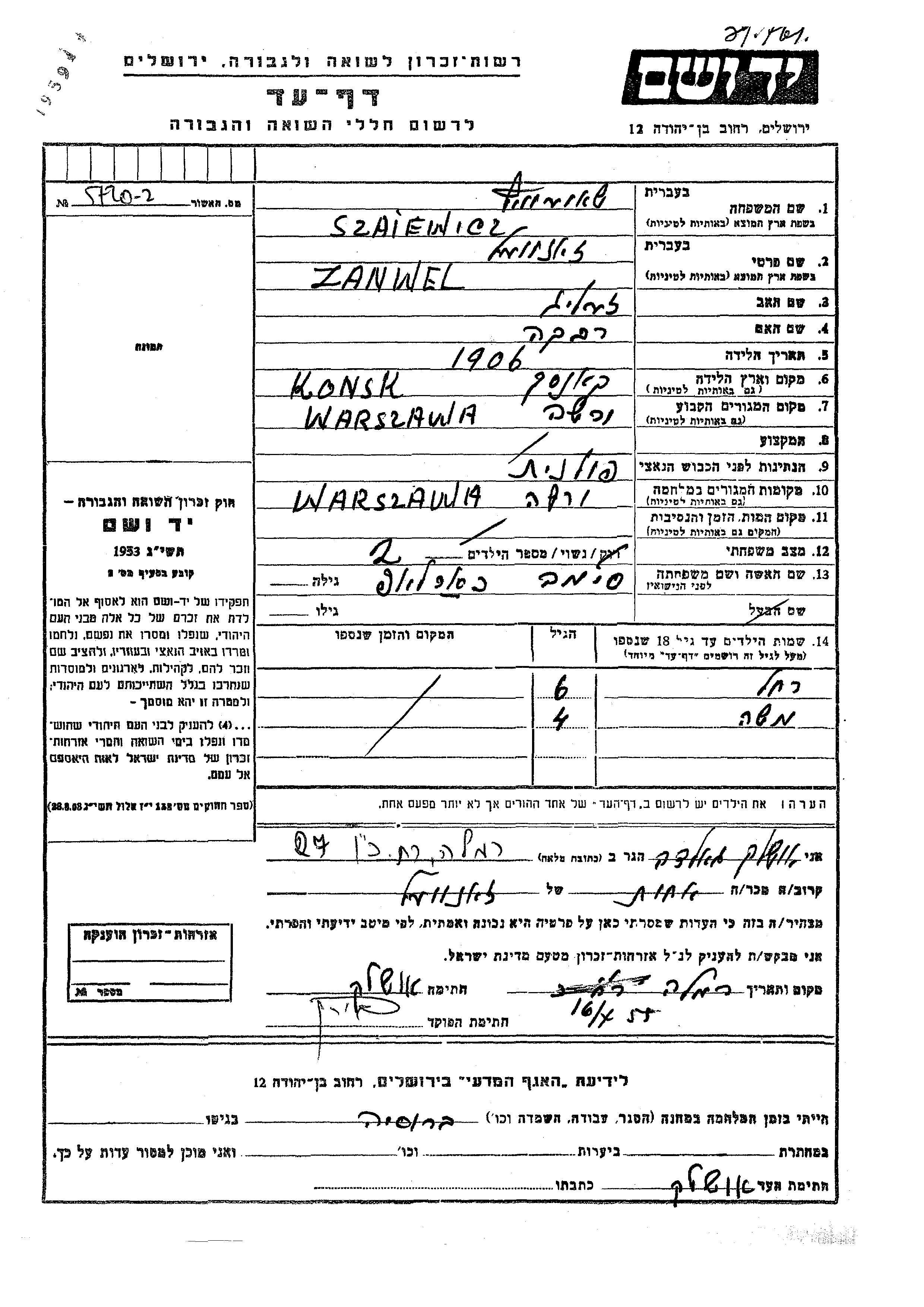 Zanwel Szaiewicze wurde im Jahr 1906 in Konsk, Polen geboren. Er war der Sohn von Zelig und Rivka. Er war mit Sima, geb. Korlap Verheiratet. Vor dem Zweiten Weltkrieg lebte er in Warszawa, Polen. Während des Krieges war er in Warszawa, Polen.