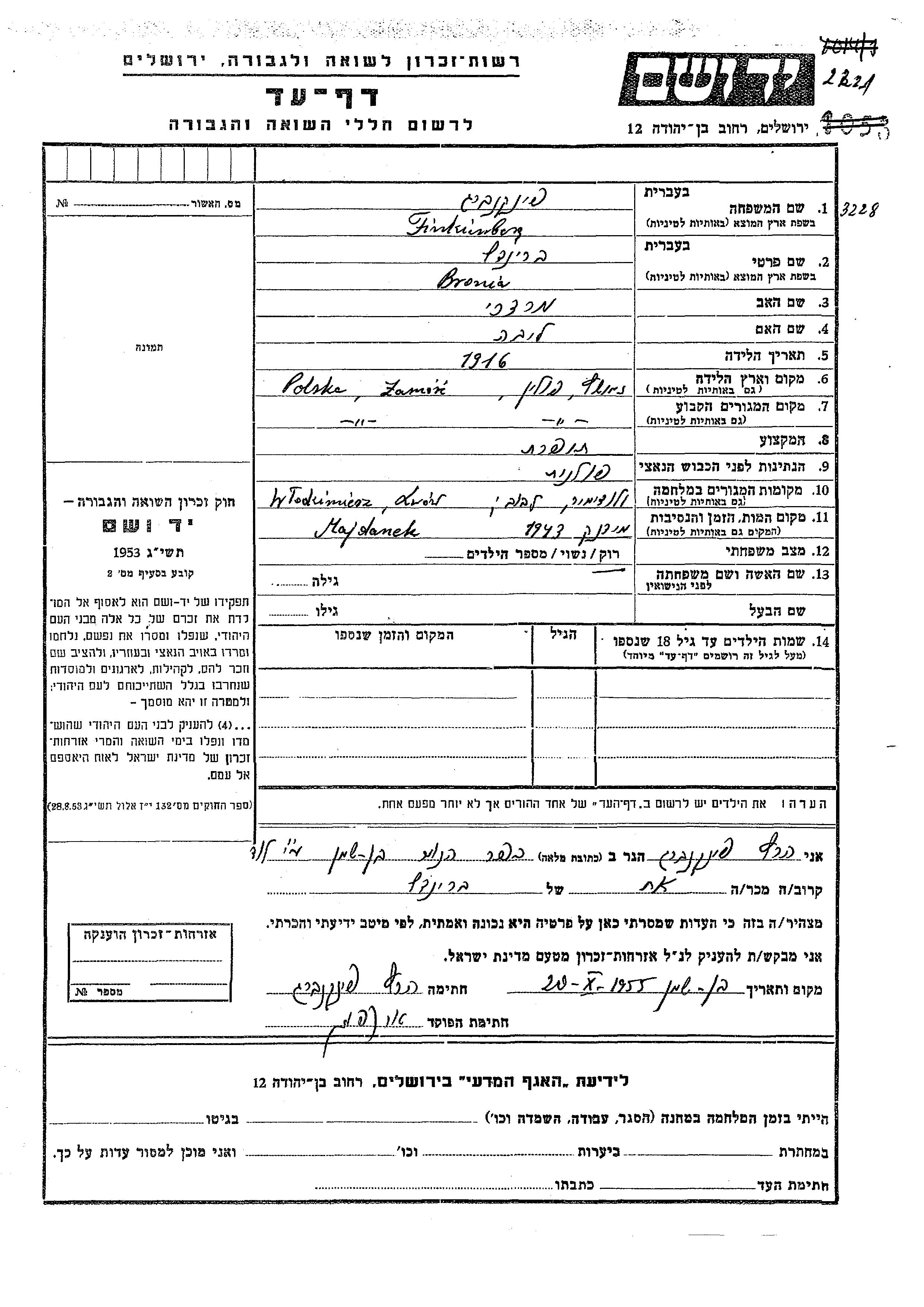 Bronia Breina Finkienberg wurde im Jahr 1916 in Zamosc, Polen geboren. Sie war die Tochter von Mordekhai und Liba. Sie war Schneiderin und Ledig. Vor dem Zweiten Weltkrieg lebte sie in Zamosc, Polen. Während des Krieges war sie in Lwow, Polen.