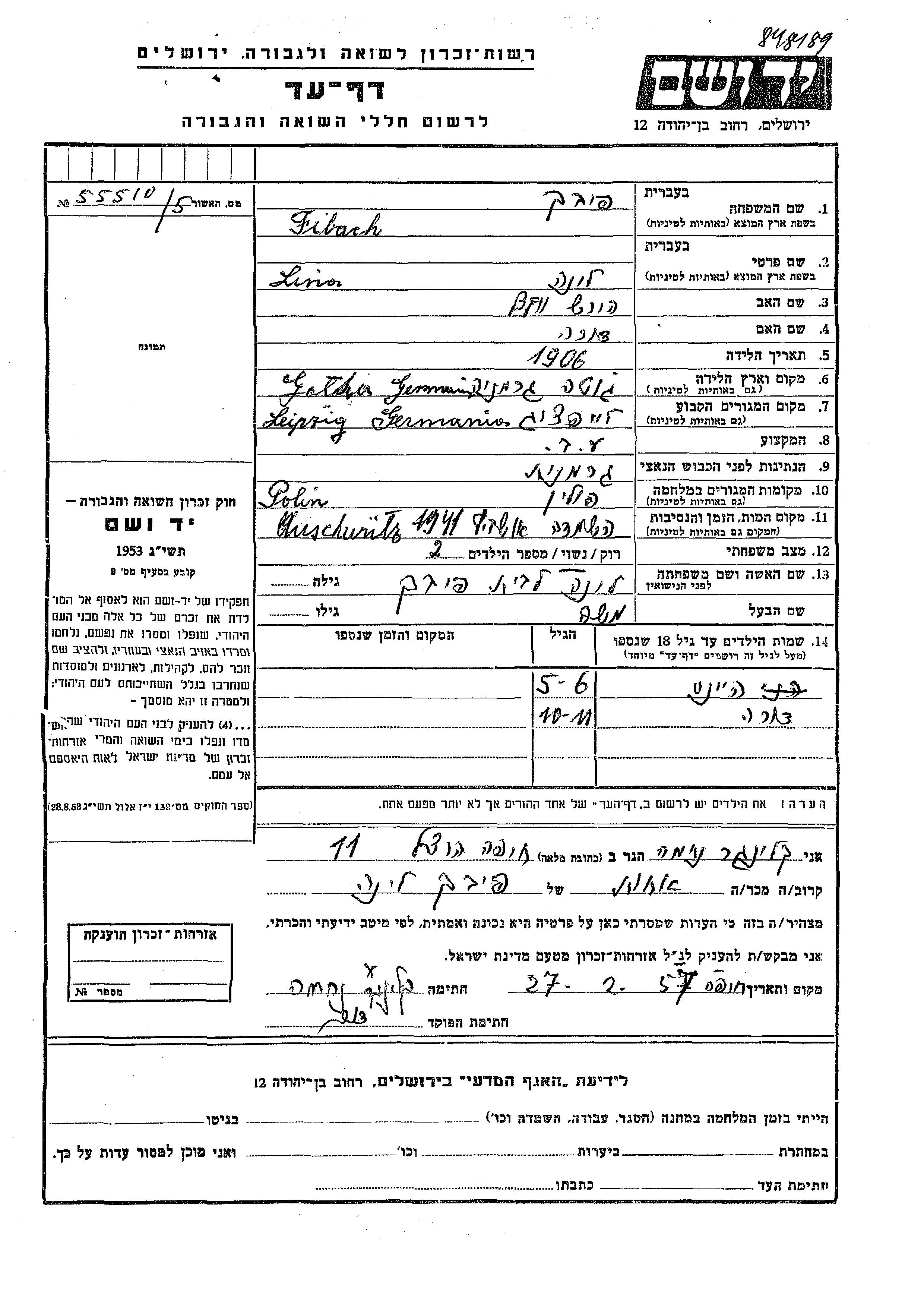 Lina Name unbekannt, geb. Fibach wurde im Jahr 1906 in Gotha, Deutsches Reich geboren. Sie war die Tochter von Hirsh Volf und Dora. Sie war Hausfrau und mit Moshe Verheiratet. Vor dem Zweiten Weltkrieg lebte sie in Leipzig, Deutsches Reich. Während des Krieges war sie in Polen.