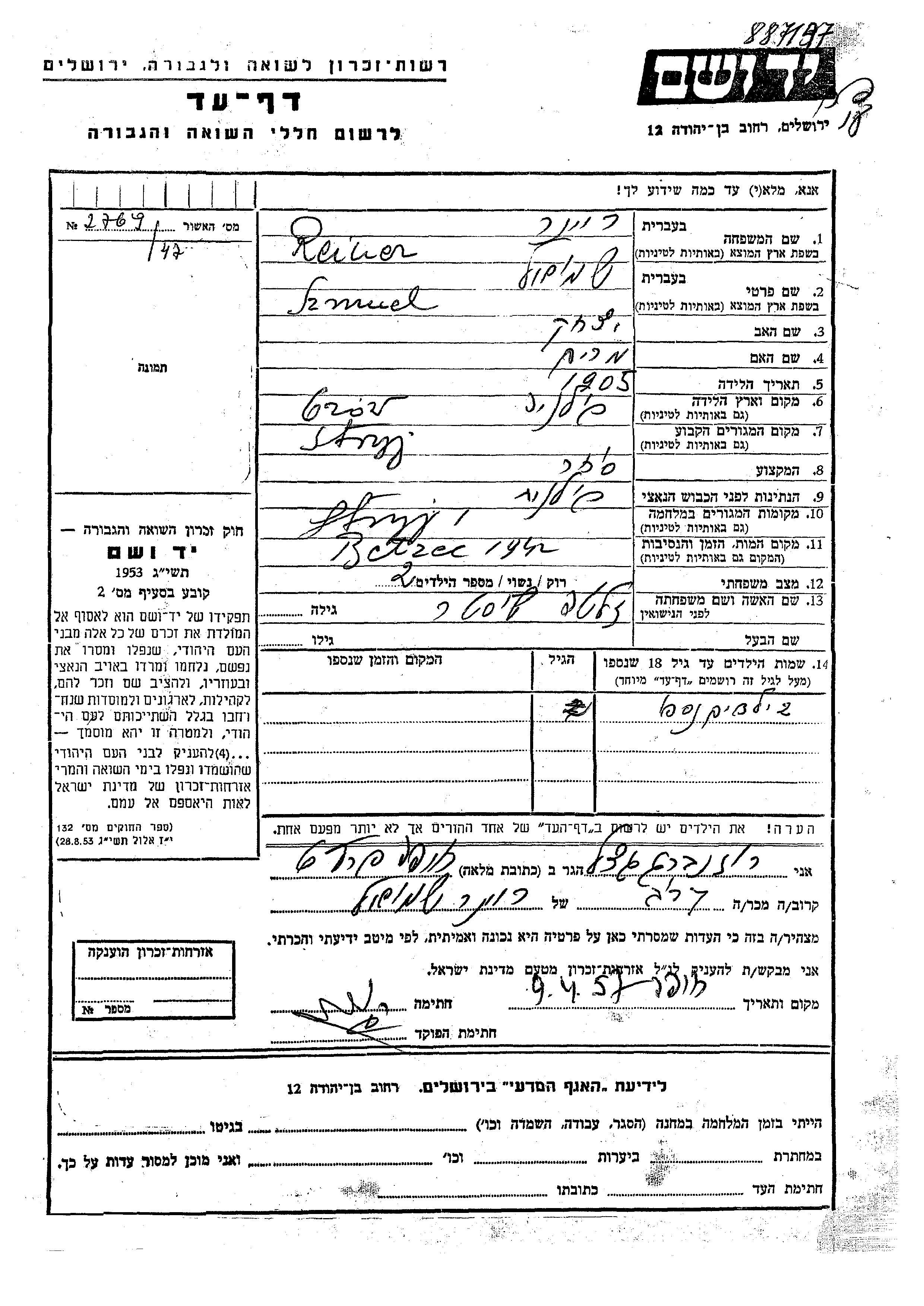 Szmuel wurde in der Schoah ermordet. Todesort: Belzec, Polen im Jahr 1942.