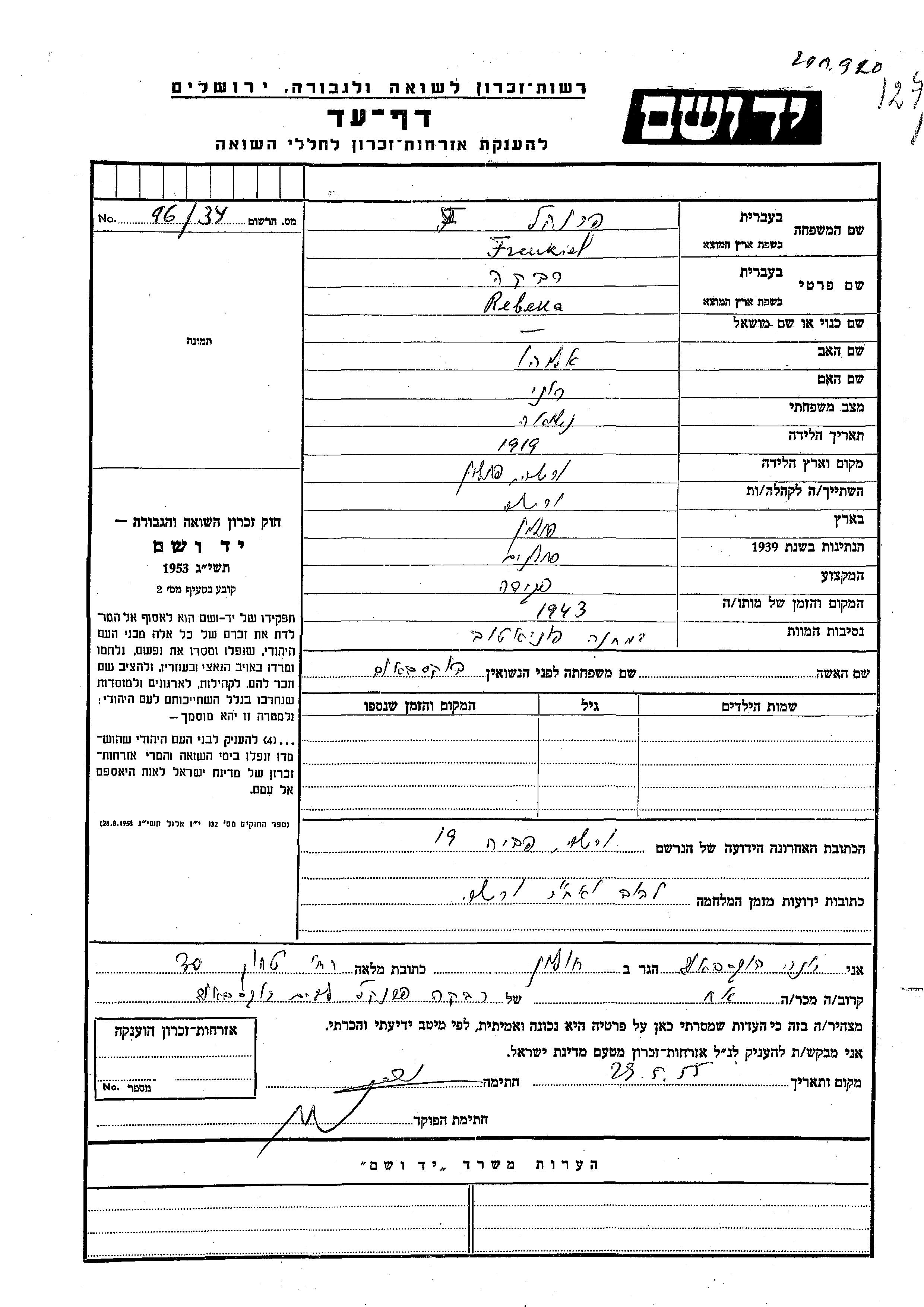 Rebeka Frenkiel, geb. Buksbaum wurde im Jahr 1919 in Warszawa, Polen geboren. Sie war die Tochter von Eliahu und Roni. Sie war Angestellte/-r. Vor dem Zweiten Weltkrieg lebte sie in Warszawa, Polen. Während des Krieges war sie in Lwow, Polen.