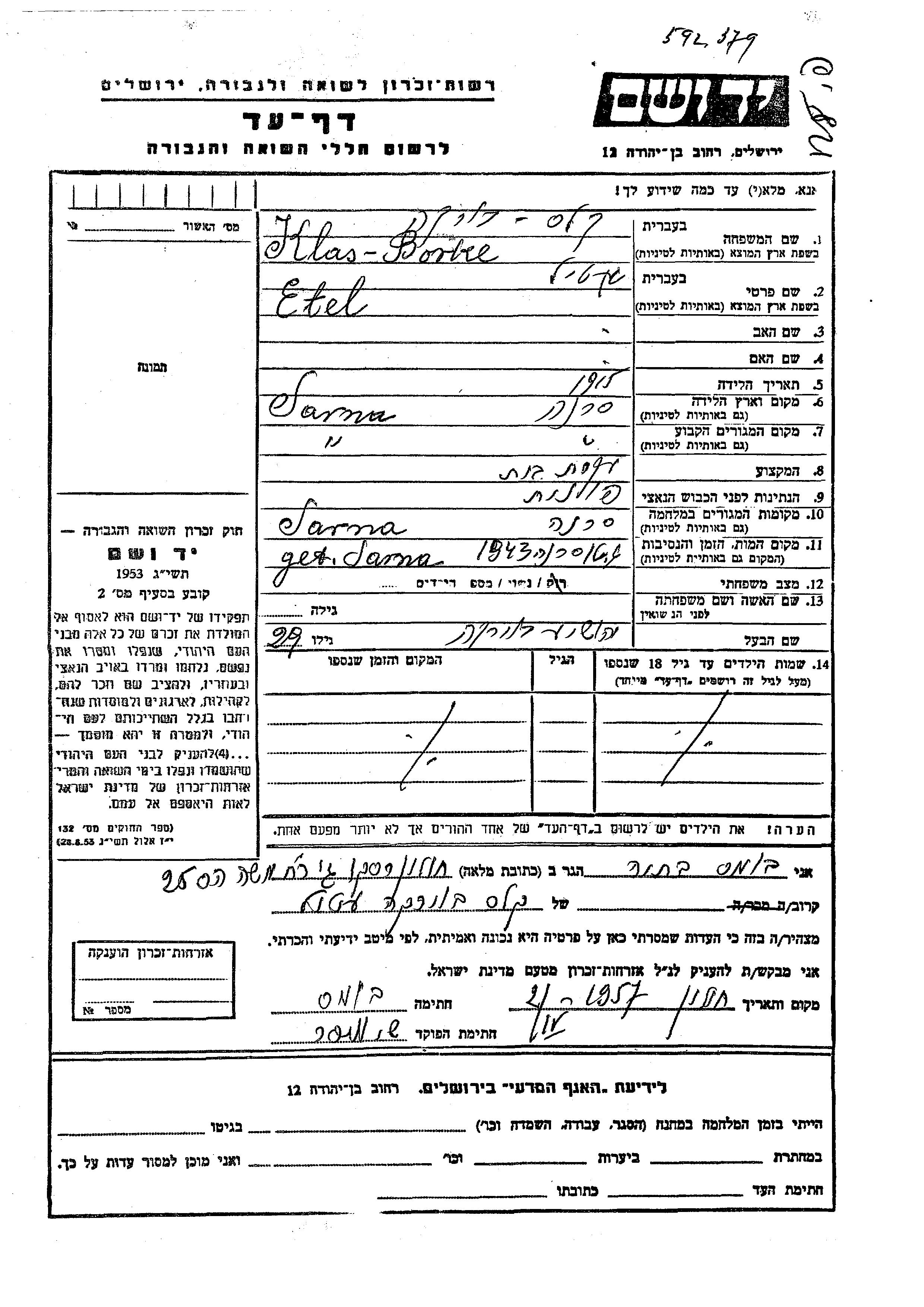Etel Klas Kles Burka wurde im Jahr 1915 in Sarna, Polen geboren. Sie war Hausfrau und mit Yehoshua Verheiratet. Vor dem Zweiten Weltkrieg lebte sie in Sarna, Polen. Während des Krieges war sie in Sarna, Polen.
