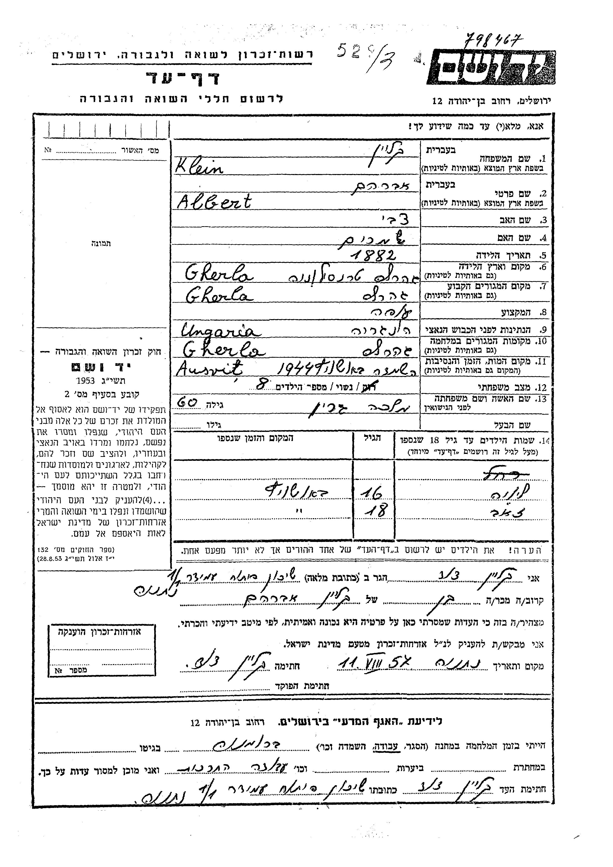 Albert Avraham Klein wurde im Jahr 1882 in Gherla, Rumänien geboren. Er war der Sohn von Tzvi und Miriam. Er war Bäcker/-in und mit Malka, geb. Grin Verheiratet. Vor dem Zweiten Weltkrieg lebte er in Gherla, Rumänien. Während des Krieges war er in Gherla, Rumänien.