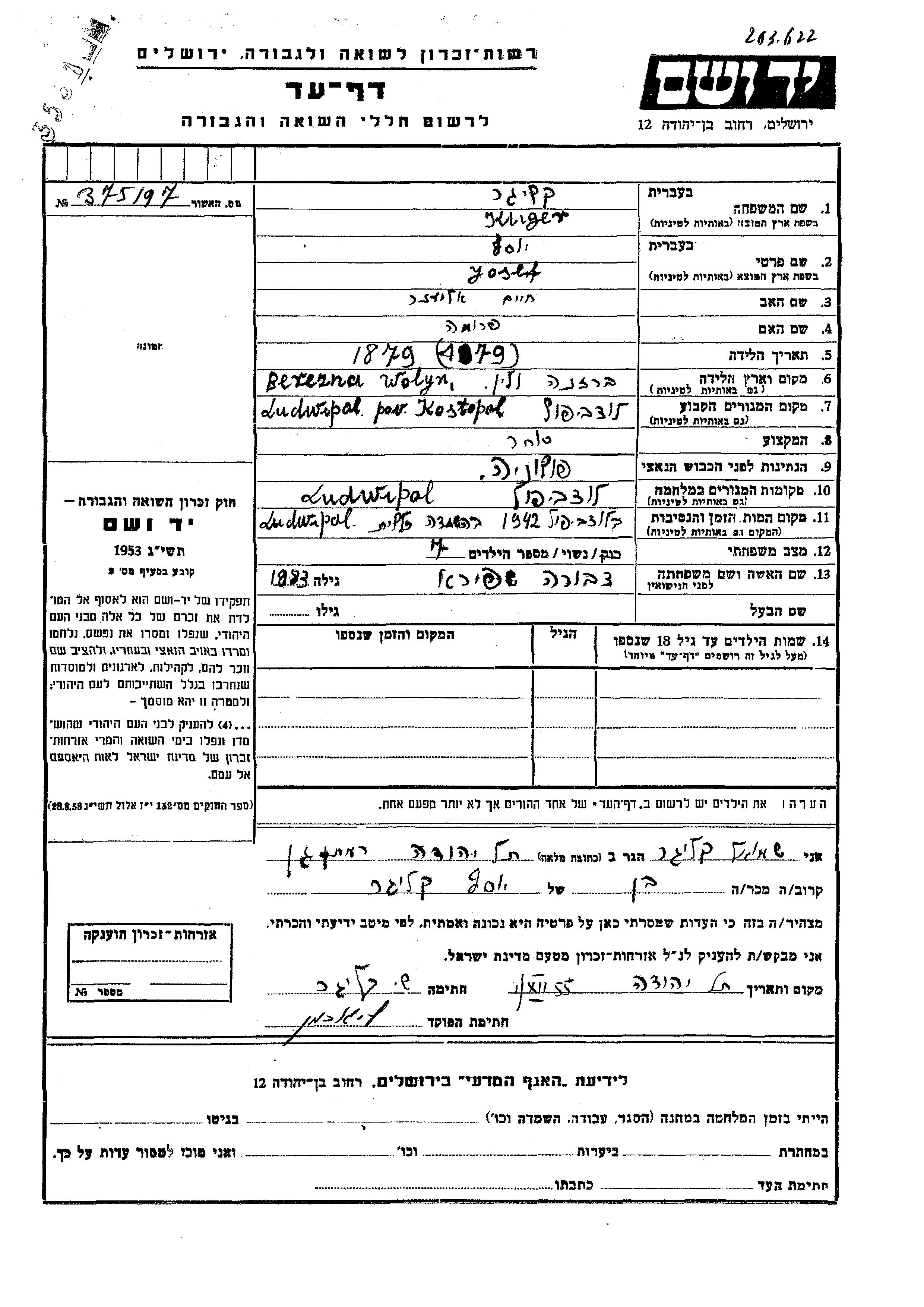Yosef Kliger wurde im Jahr 1879 in Berezne, Polen geboren. Er war der Sohn von Khaim Eliezer und Fruma. Er war Kaufmann/-frau und mit Dvora, geb. Shapira Verheiratet. Vor dem Zweiten Weltkrieg lebte er in Ludwipol, Polen. Während des Krieges war er in Ludwipol, Polen.