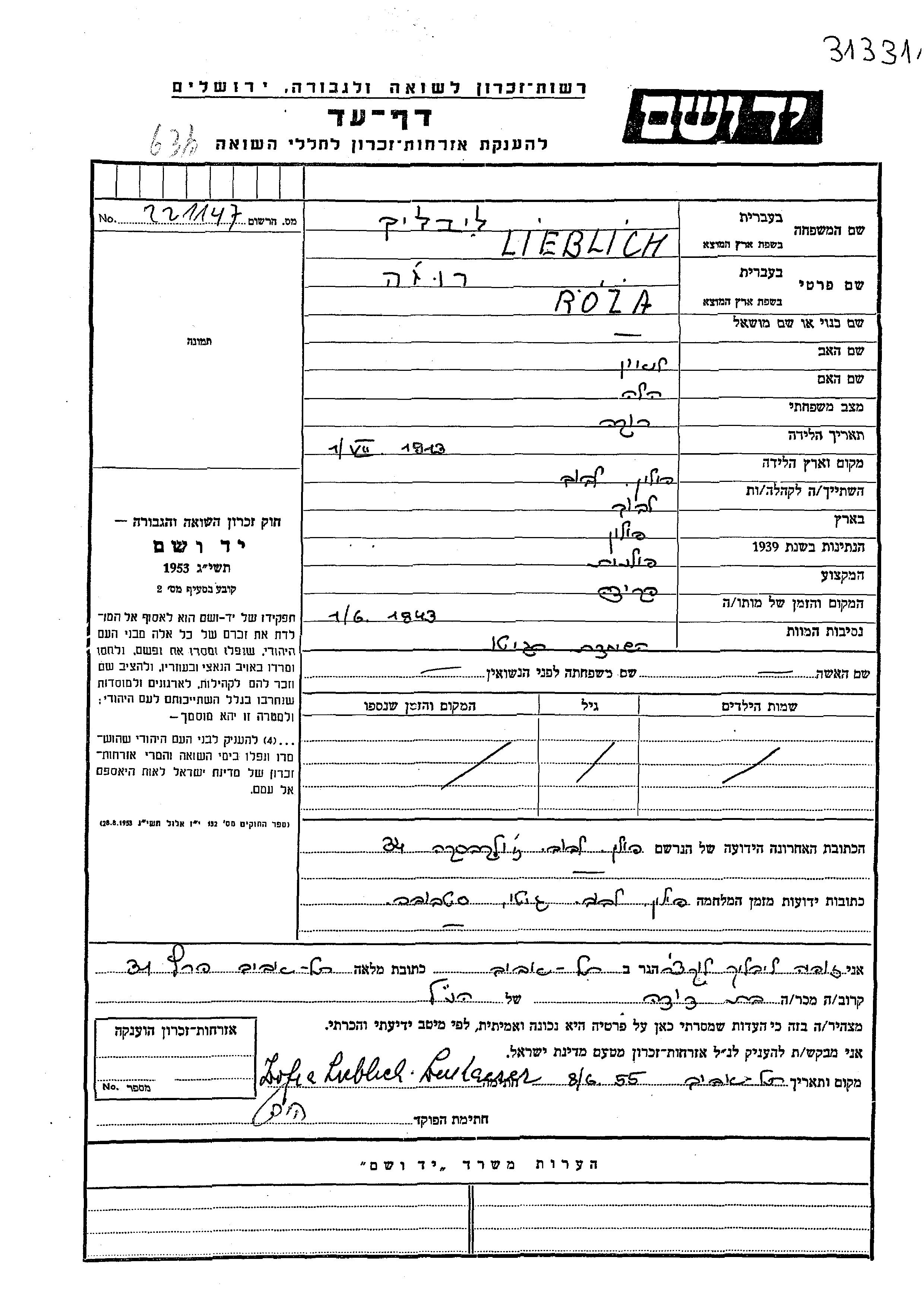 Roza Lieblich wurde im Jahr 1913 in Lwow, Polen geboren. Sie war die Tochter von Leon und Hela. Sie war Angestellte/-r und Ledig. Vor dem Zweiten Weltkrieg lebte sie in Lwow, Polen. Während des Krieges war sie in Lwow, Polen.