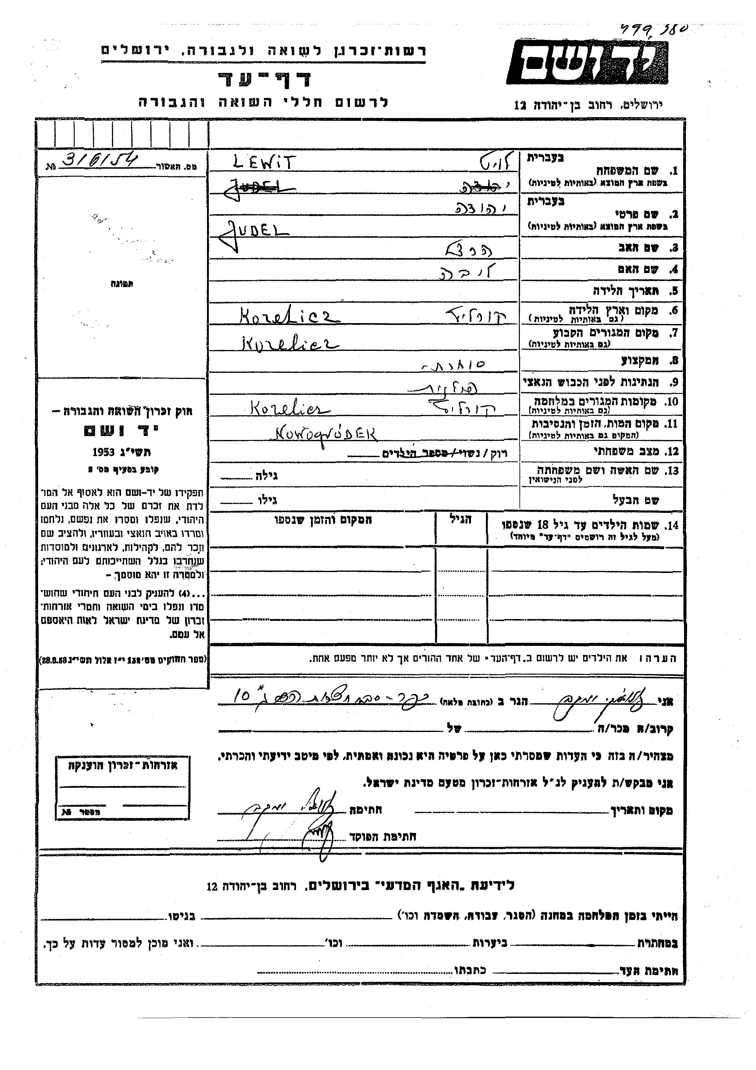 Judel Levit wurde in Korelicz, Polen geboren. Er war der Sohn von Hertzel und Liba. Er war Kaufmann/-frau und Ledig. Vor dem Zweiten Weltkrieg lebte er in Korelicz, Polen. Während des Krieges war er in Korelicz, Polen.