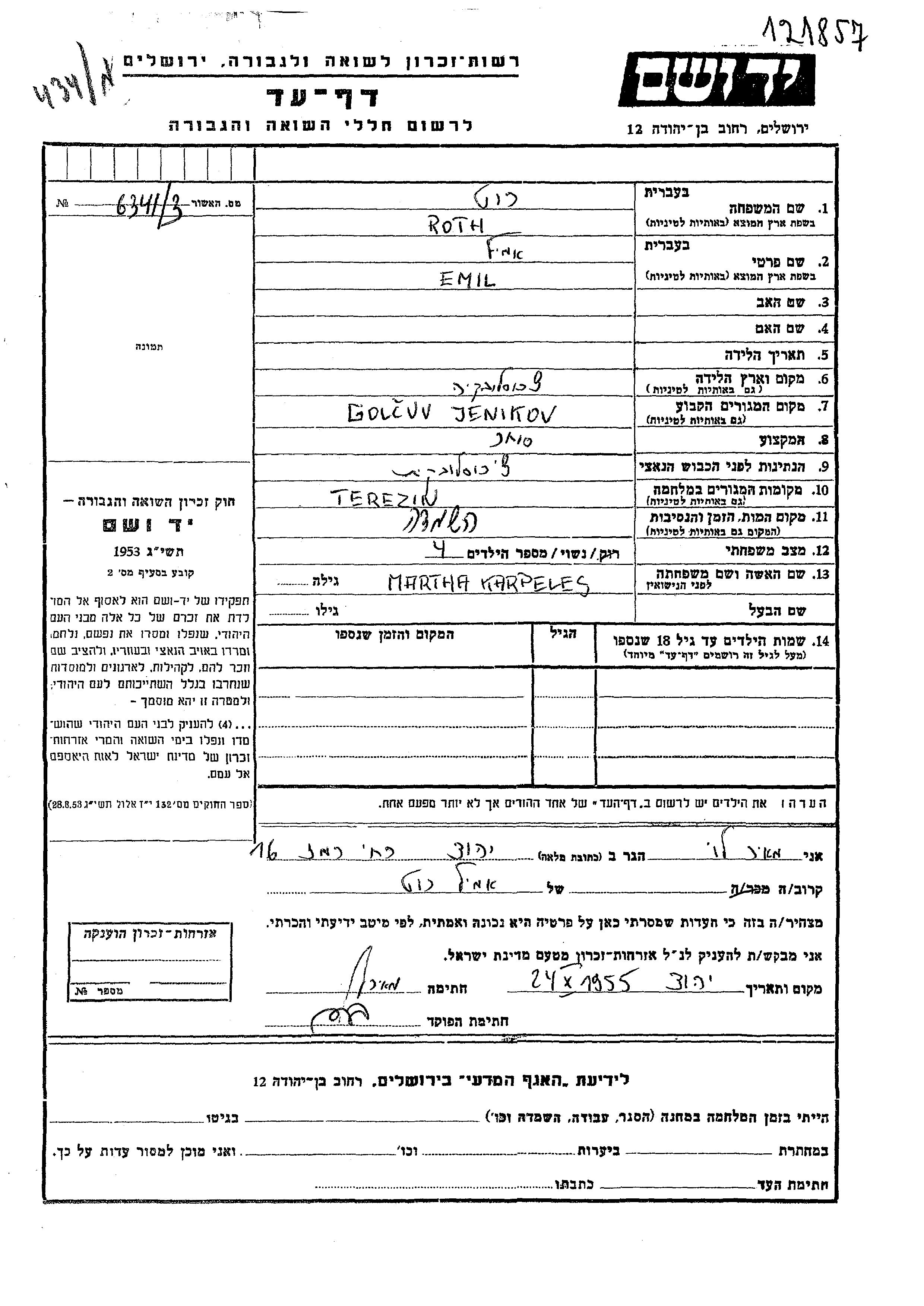 Emil Roth Rut wurde in Tschechoslowakei geboren. Er war Kaufmann/-frau und mit Marta, geb. Karpeles Verheiratet. Vor dem Zweiten Weltkrieg lebte er in Golcuv Jenikov, Tschechoslowakei. Während des Krieges war er in Terezin, Tschechoslowakei.