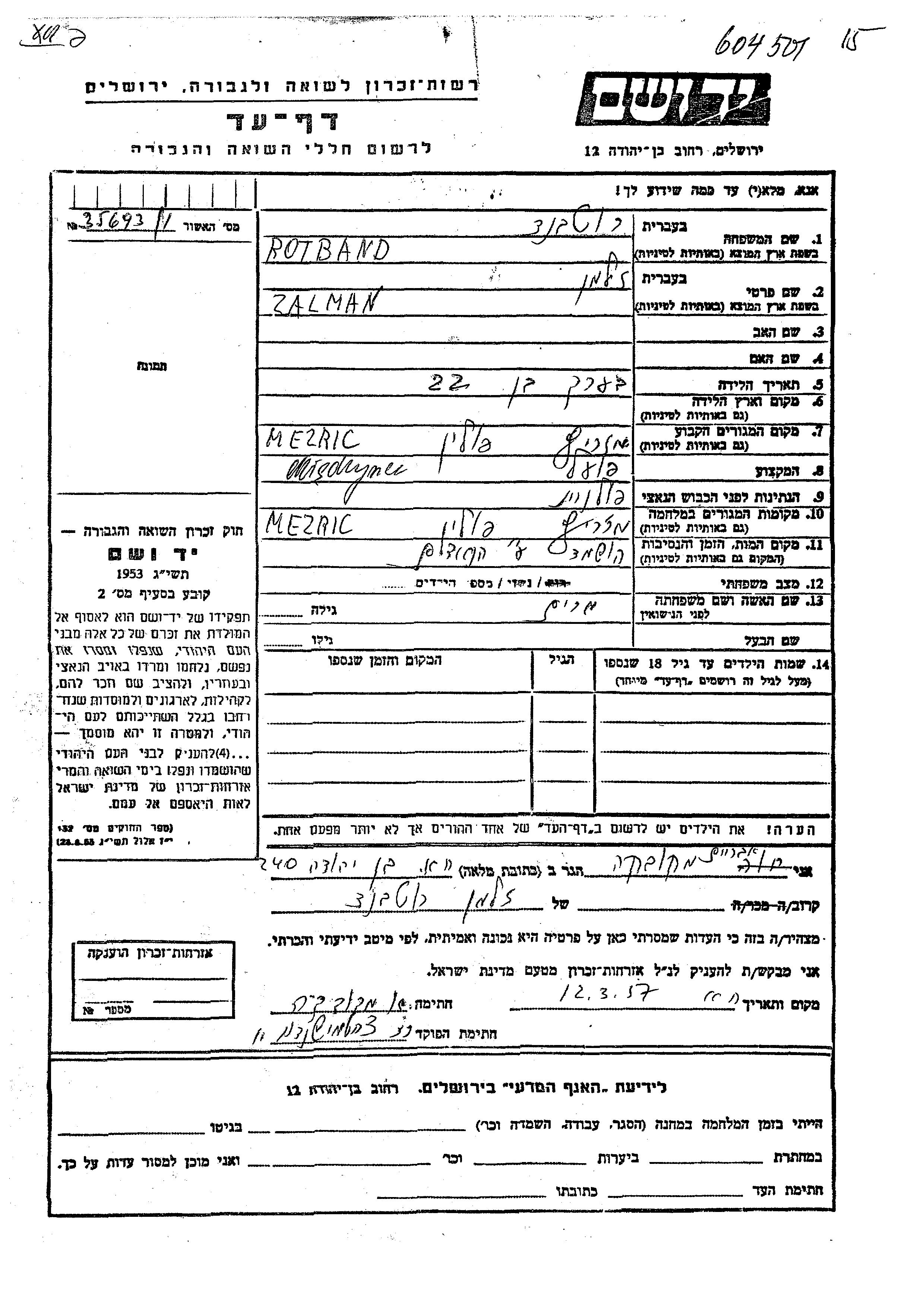 Zalman Rotband. Er war Arbeiter/-in und mit Miriam Verheiratet. Vor dem Zweiten Weltkrieg lebte er in Mezrich, Polen. Während des Krieges war er in Mezrich, Polen.