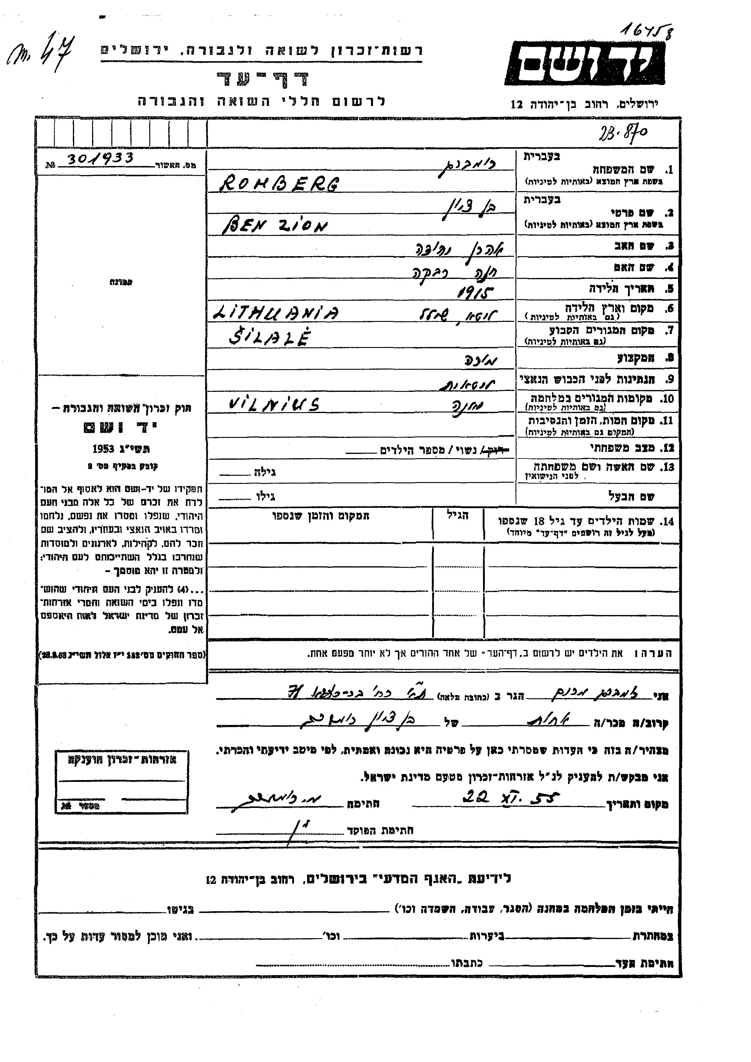 Ben Zion Romberg wurde im Jahr 1915 in Silale, Litauen geboren. Er war der Sohn von Aharon Yehuda und Khana Rivka. Er war Lehrer/in und Verheiratet. Vor dem Zweiten Weltkrieg lebte er in Silale, Litauen. Während des Krieges war er in Vilnius, Polen.