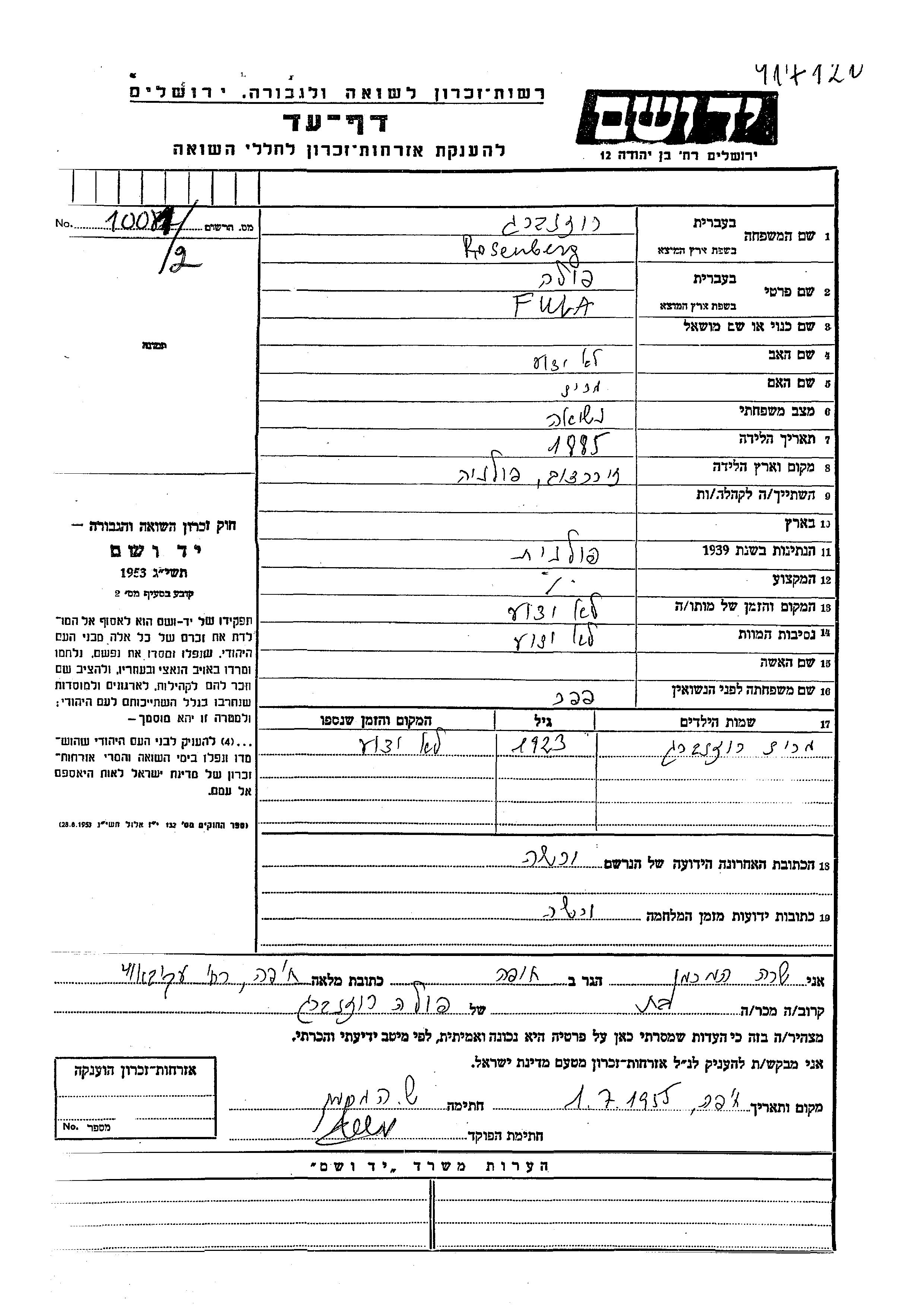 Fula Pola Rosenberg, geb. Fefer wurde im Jahr 1885 in Zyrardow, Polen geboren. Sie war die Tochter von Miriam. Sie war Verheiratet. Vor dem Zweiten Weltkrieg lebte sie in Warszawa, Polen. Während des Krieges war sie in Warszawa, Polen.