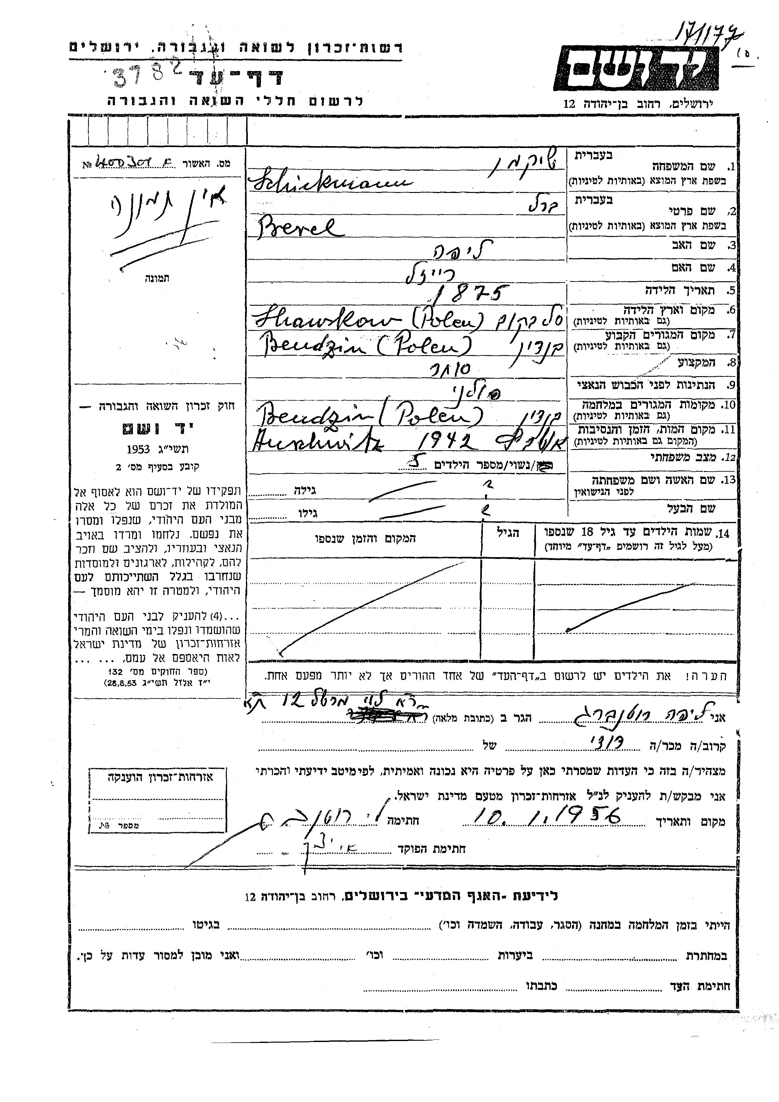 Berl Schickmann wurde im Jahr 1875 in Slawkow, Polen geboren. Er war der Sohn von Lipa und Reizl. Er war Kaufmann/-frau und Verheiratet. Vor dem Zweiten Weltkrieg lebte er in Bendzin, Polen. Während des Krieges war er in Bendzin, Polen.